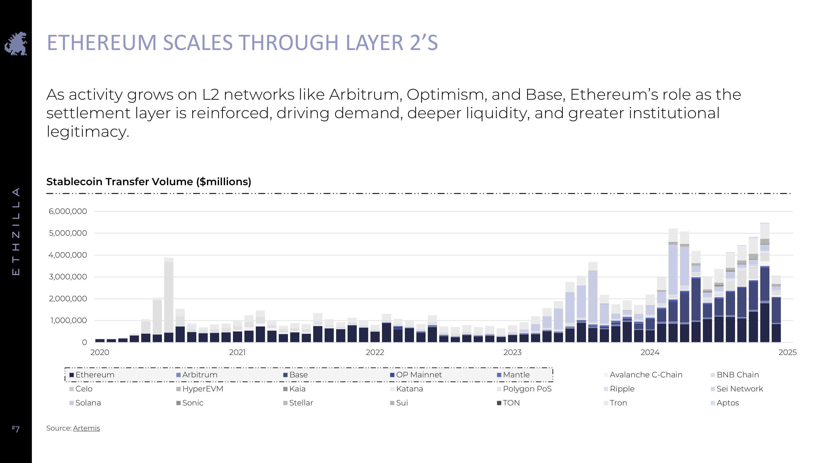 # 7 ETHEREUM SCALES THROUGH LAYER 2’S Source: Artemis As activity grows on L2 networks like Arbitrum , Optimism, and Base, Ethereum’s role as the settlement layer is reinforced, driving demand, deeper liquidity, and greater institutional legitimacy. Stablecoin Transfer Volume ($millions) 0 1,000,000 2,000,000 3,000,000 4,000,000 5,000,000 6,000,000 2020 2021 2022 2023 2024 2025 Ethereum Arbitrum Base OP Mainnet Mantle Avalanche C-Chain BNB Chain Celo HyperEVM Kaia Katana Polygon PoS Ripple Sei Network Solana Sonic Stellar Sui TON Tron Aptos