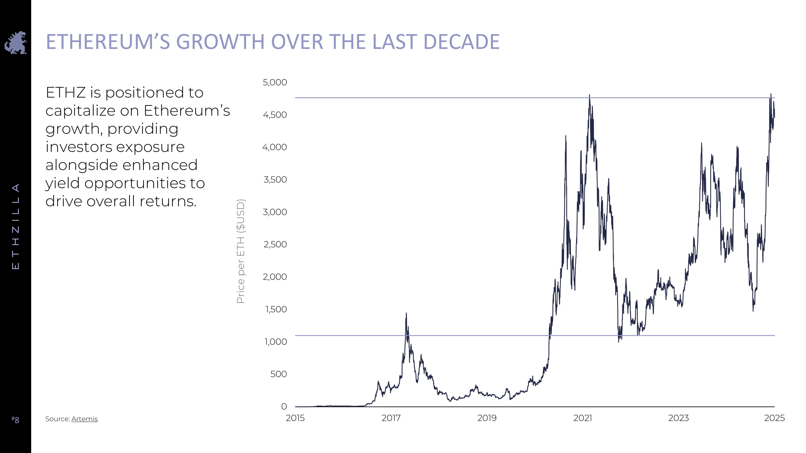 # 8 ETHEREUM’S GROWTH OVER THE LAST DECADE Source: Artemis ETHZ is positioned to capitalize on Ethereum’s growth, providing investors exposure alongside enhanced yield opportunities to drive overall returns. 0 500 1,000 1,500 2,000 2,500 3,000 3,500 4,000 4,500 5,000 2015 2017 2019 2021 2023 2025 Price per ETH ($USD)
