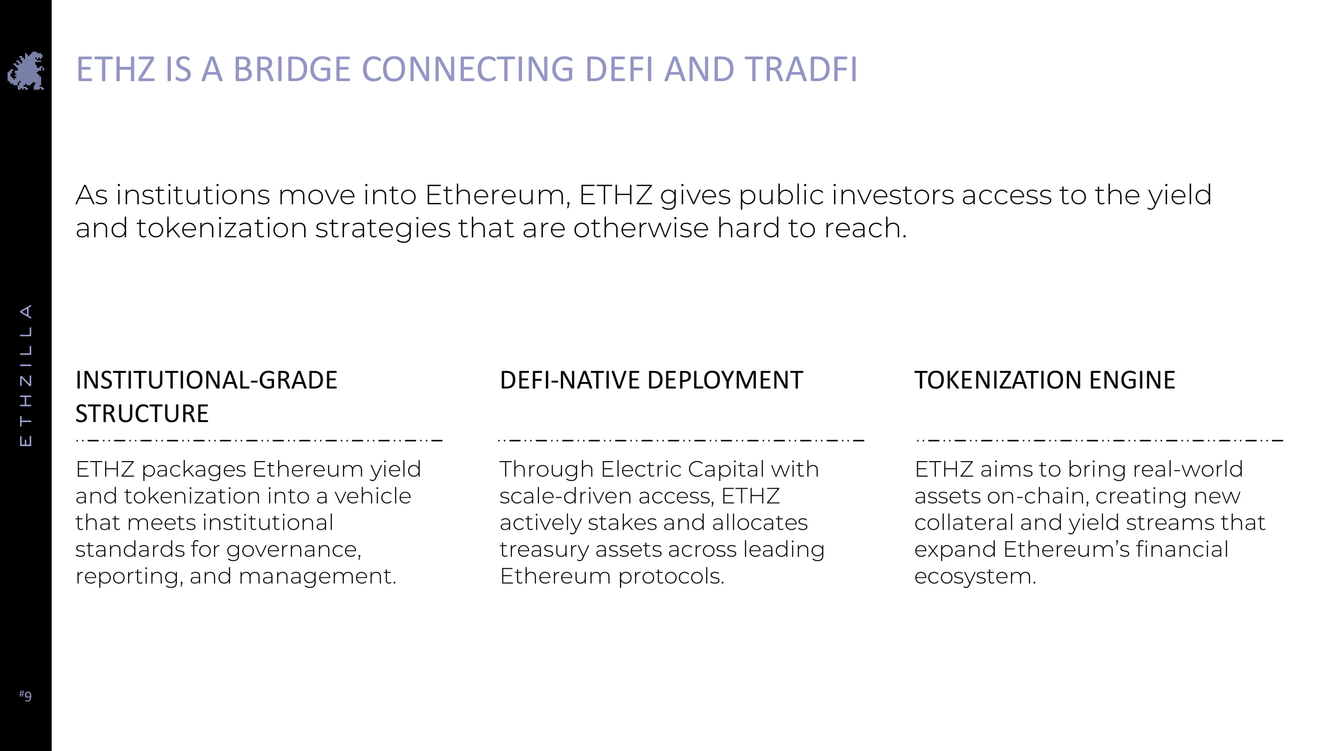 # 9 ETHZ IS A BRIDGE CONNECTING DEFI AND TRADFI ETHZ packages Ethereum yield and tokenization into a vehicle that meets institutional standards for governance, reporting, and management. Through Electric Capital with scale - driven access, ETHZ actively stakes and allocates treasury assets across leading Ethereum protocols. ETHZ aims to bring real - world assets on - chain, creating new collateral and yield streams that expand Ethereum’s financial ecosystem. INSTITUTIONAL - GRADE STRUCTURE DEFI - NATIVE DEPLOYMENT TOKENIZATION ENGINE As institutions move into Ethereum, ETHZ gives public investors access to the yield and tokenization strategies that are otherwise hard to reach.