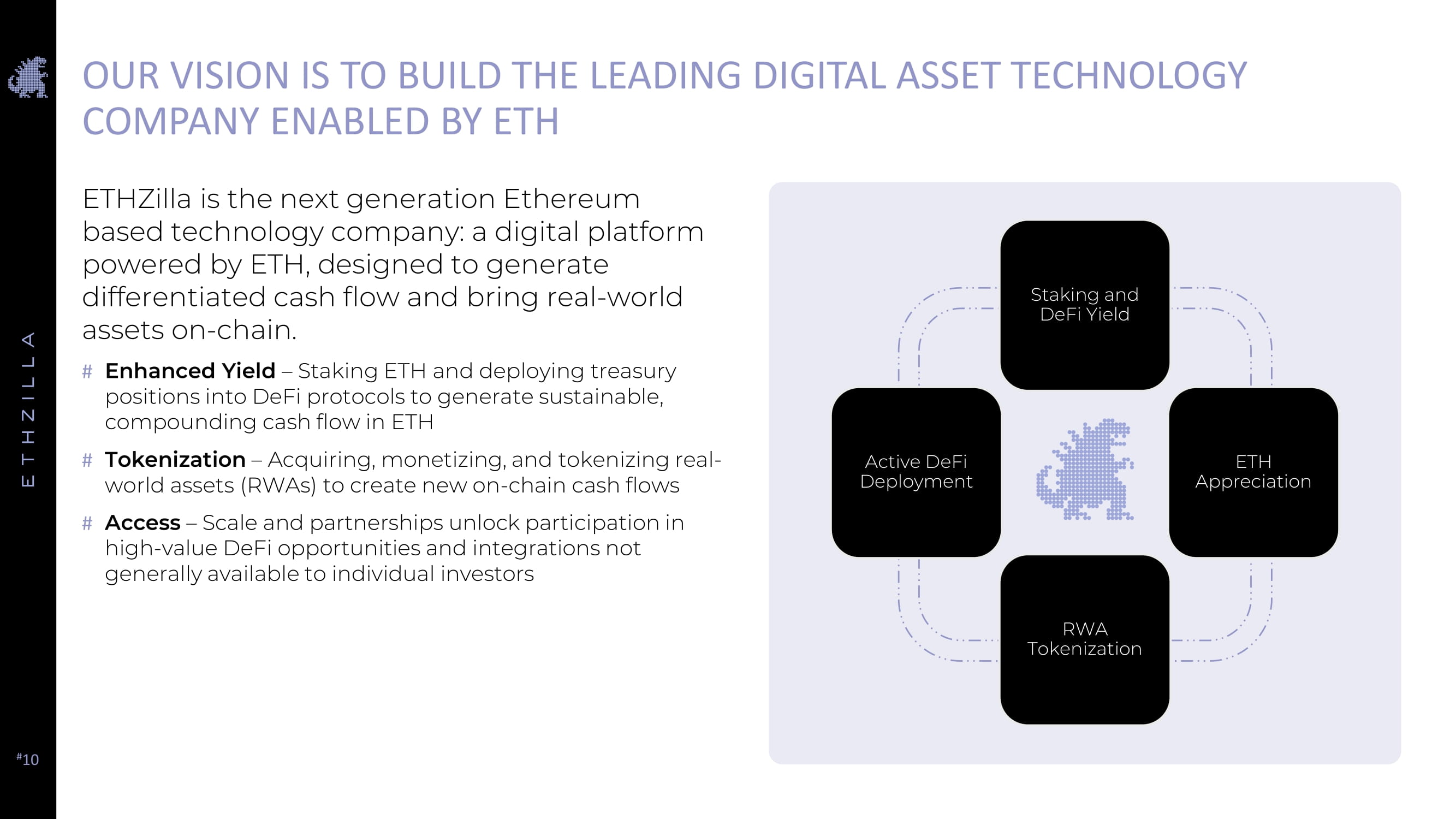 # 10 OUR VISION IS TO BUILD THE LEADING DIGITAL ASSET TECHNOLOGY COMPANY ENABLED BY ETH ETHZilla is the next generation Ethereum based technology company: a digital platform powered by ETH, designed to generate differentiated cash flow and bring real - world assets on - chain. # Enhanced Yield – Staking ETH and deploying treasury positions into DeFi protocols to generate sustainable, compounding cash flow in ETH # Tokenization – Acquiring, monetizing, and tokenizing real - world assets (RWAs) to create new on - chain cash flows # Access – Scale and partnerships unlock participation in high - value DeFi opportunities and integrations not generally available to individual investors Staking and DeFi Yield RWA Tokenization ETH Appreciation Active DeFi Deployment