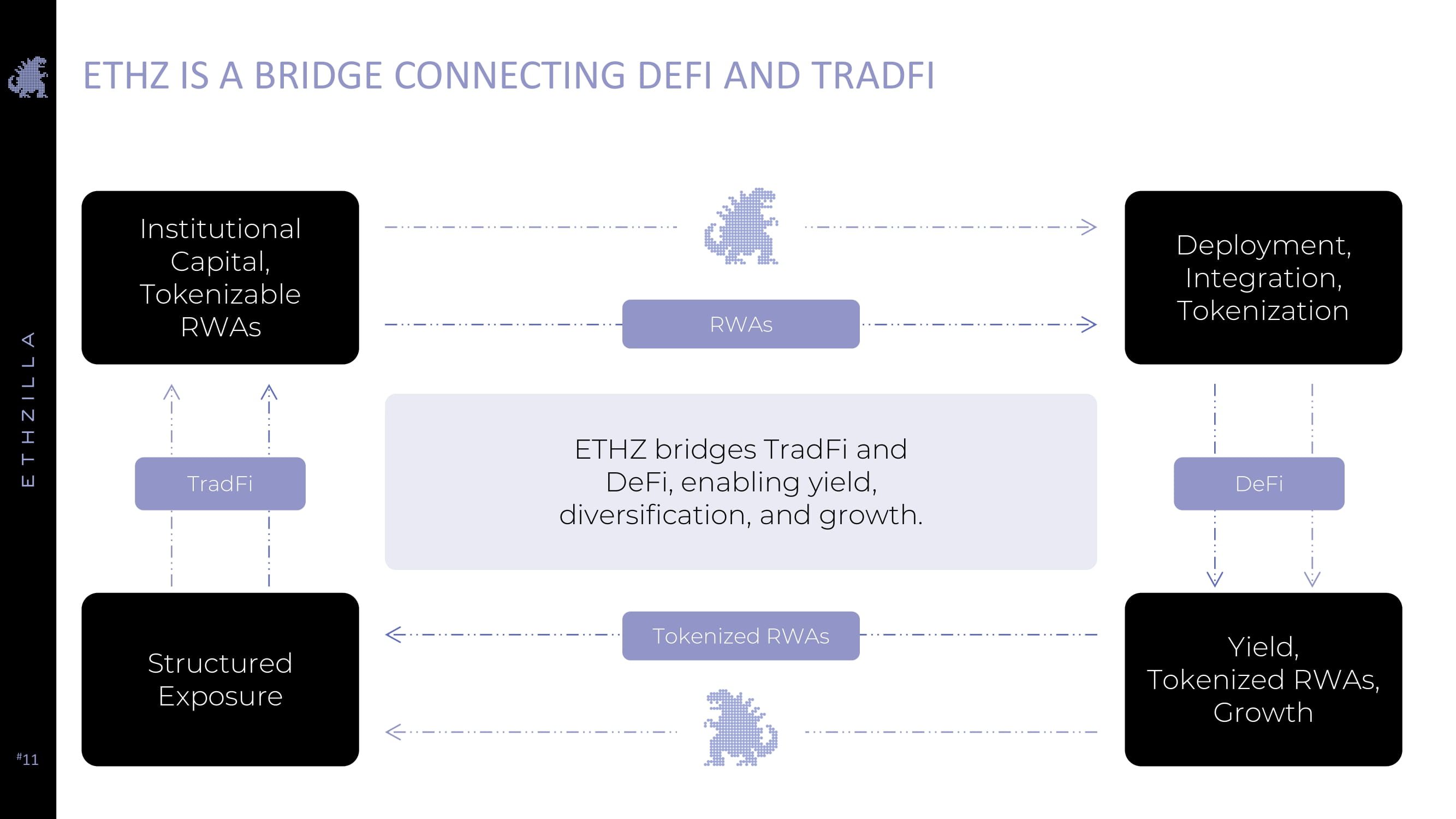 # 11 ETHZ bridges TradFi and DeFi, enabling yield, diversification, and growth. Institutional Capital, Tokenizable RWAs ETHZ IS A BRIDGE CONNECTING DEFI AND TRADFI Structured exposure Yield, Tokenized RWAs, Growth Deployment, Integration, Tokenization Structured Exposure Yield, Tokenized RWAs, Growth RWAs Tokenized RWAs TradFi DeFi