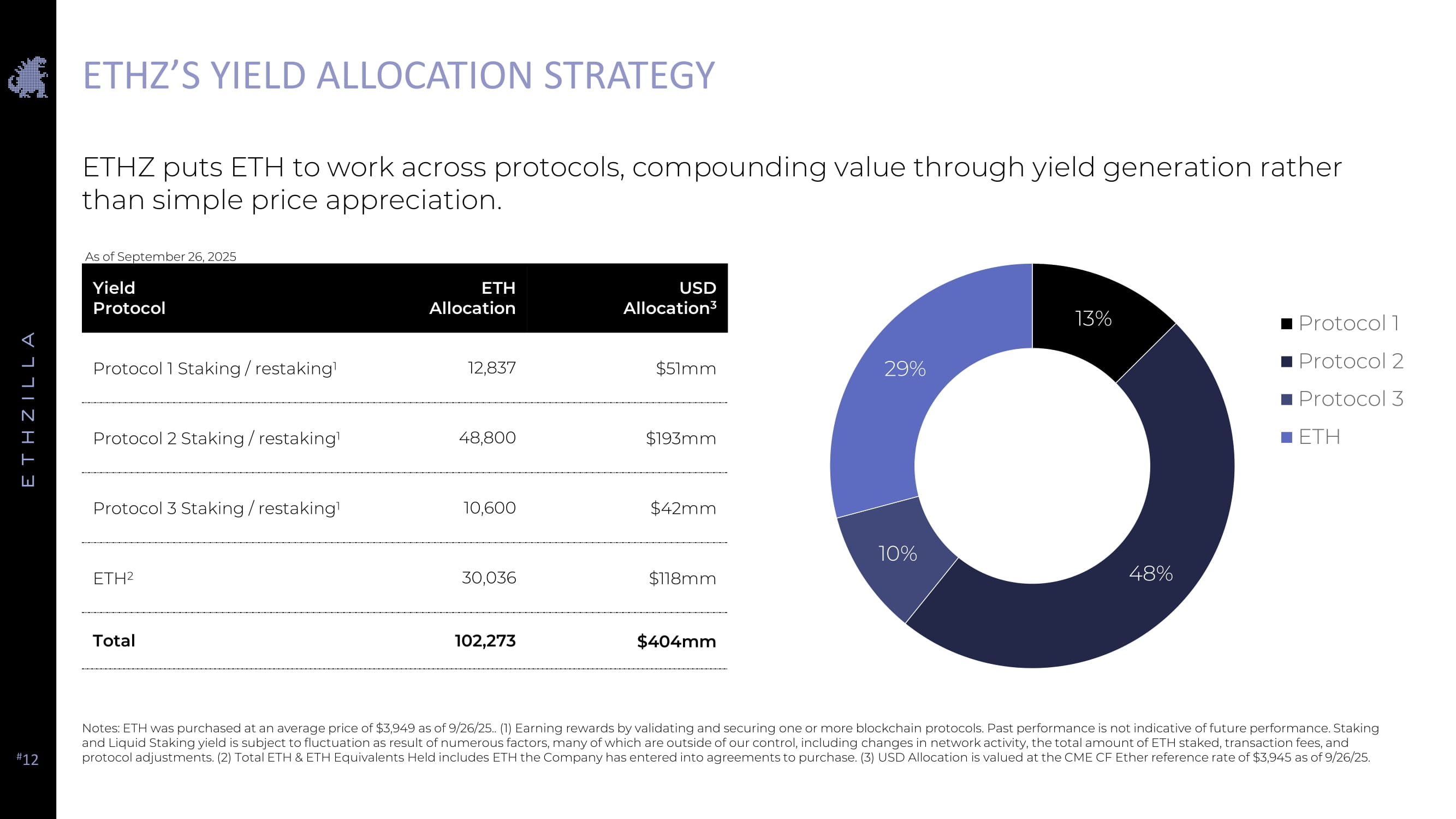 # 12 ETHZ’S YIELD ALLOCATION STRATEGY Notes: ETH was purchased at an average price of $3,949 as of 9/26/25.. (1) Earning rewards by validating and securing one or mor e blockchain protocols. Past performance is not indicative of future performance. Staking and Liquid Staking yield is subject to fluctuation as result of numerous factors, many of which are outside of our control, i ncl uding changes in network activity, the total amount of ETH staked, transaction fees, and protocol adjustments. (2) Total ETH & ETH Equivalents Held includes ETH the Company has entered into agreements to purchase. (3) USD Allocation is valued at the CME CF Ether reference rate of $3,945 as of 9/26/25. ETHZ puts ETH to work across protocols, compounding value through yield generation rather than simple price appreciation. USD Allocation 3 ETH Allocation Yield Protocol $51mm 12,837 Protocol 1 Staking / restaking 1 $193mm 48,800 Protocol 2 Staking / restaking 1 $42mm 10,600 Protocol 3 Staking / restaking 1 $118mm 30,036 ETH 2 $404mm 102,273 Total 13% 48% 10% 29% Protocol 1 Protocol 2 Protocol 3 ETH As of September 26, 2025