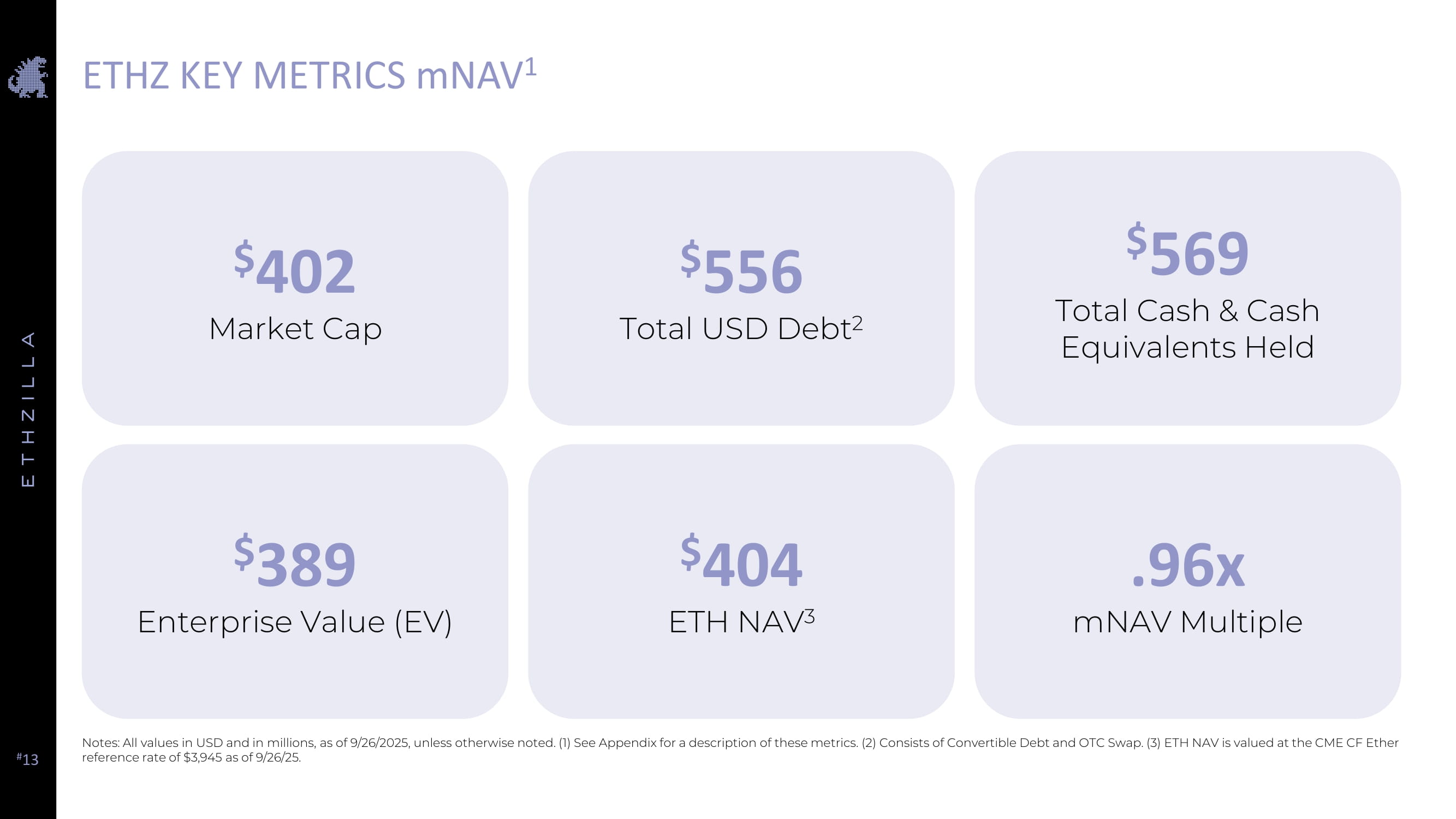 # 13 ETHZ KEY METRICS m NAV 1 Notes: All values in USD and in millions, as of 9/26/2025, unless otherwise noted. (1) See Appendix for a description of thes e m etrics. (2) Consists of Convertible Debt and OTC Swap. (3) ETH NAV is valued at the CME CF Ether reference rate of $3,945 as of 9/26/25. $ 402 Market Cap $ 569 Total Cash & Cash Equivalents Held $ 556 Total USD Debt 2 .96x mNAV Multiple $ 404 ETH NAV 3 $ 389 Enterprise Value (EV)
