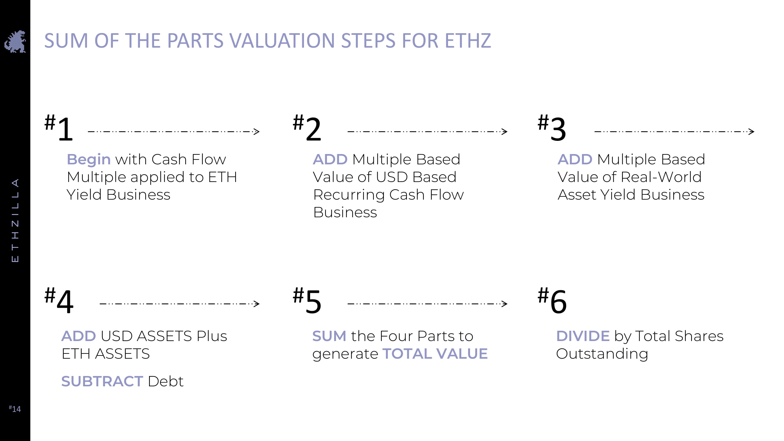 # 14 SUM OF THE PARTS VALUATION STEPS FOR ETHZ # 1 Begin with Cash Flow Multiple applied to ETH Yield Business # 2 ADD Multiple Based Value of USD Based Recurring Cash Flow Business # 3 ADD Multiple Based Value of Real - World Asset Yield Business # 4 ADD USD ASSETS Plus ETH ASSETS SUBTRACT Debt # 5 SUM the Four Parts to generate TOTAL VALUE # 6 DIVIDE by Total Shares Outstanding