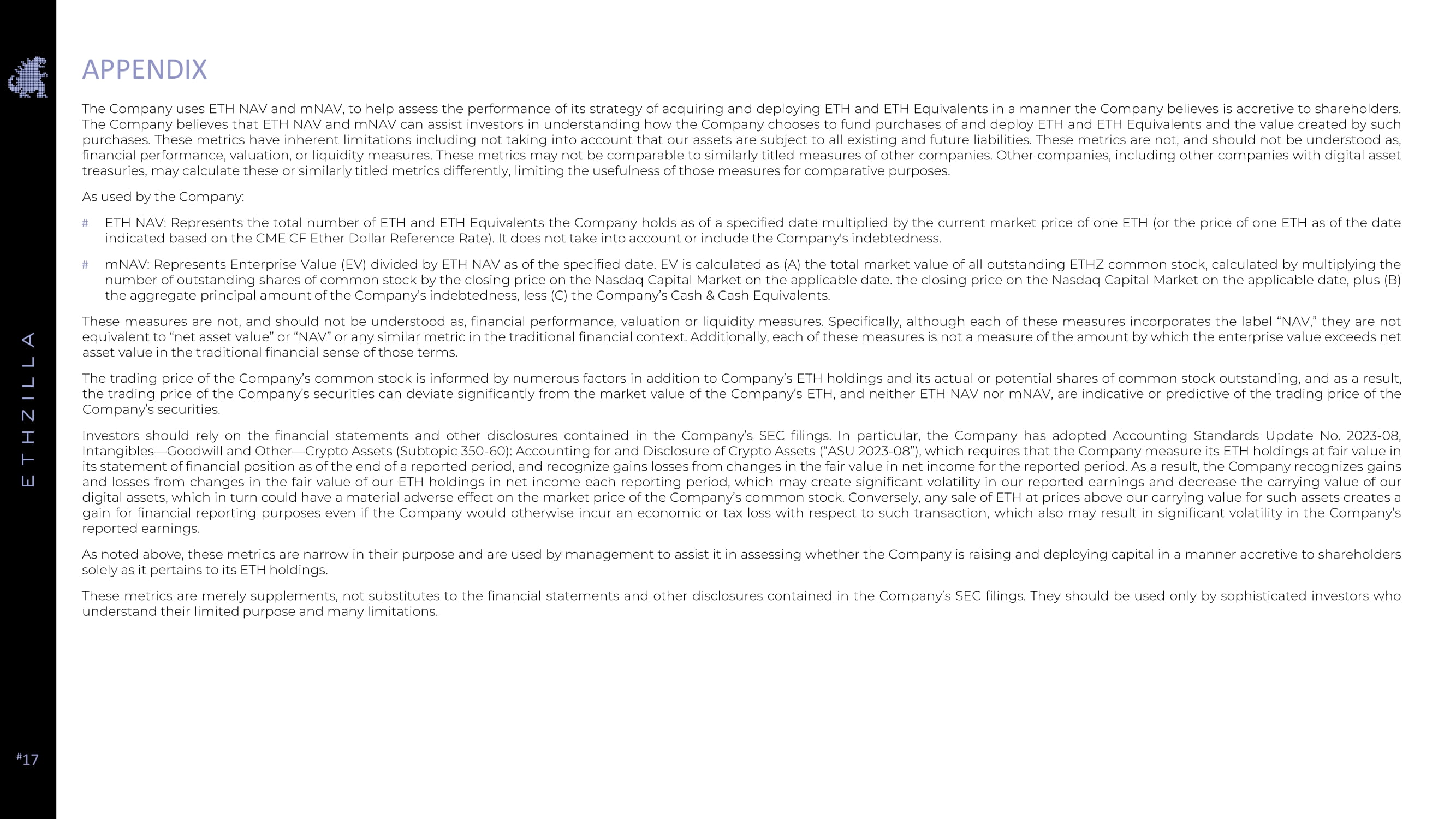 # 17 APPENDIX The Company uses ETH NAV and mNAV , to help assess the performance of its strategy of acquiring and deploying ETH and ETH Equivalents in a manner the Company believes is accretive to shareholders . The Company believes that ETH NAV and mNAV can assist investors in understanding how the Company chooses to fund purchases of and deploy ETH and ETH Equivalents and the value created by such purchases . These metrics have inherent limitations including not taking into account that our assets are subject to all existing and future liabilities . These metrics are not, and should not be understood as, financial performance, valuation, or liquidity measures . These metrics may not be comparable to similarly titled measures of other companies . Other companies, including other companies with digital asset treasuries, may calculate these or similarly titled metrics differently, limiting the usefulness of those measures for comparative purposes . As used by the Company : # ETH NAV : Represents the total number of ETH and ETH Equivalents the Company holds as of a specified date multiplied by the current market price of one ETH (or the price of one ETH as of the date indicated based on the CME CF Ether Dollar Reference Rate) . It does not take into account or include the Company's indebtedness . # mNAV : Represents Enterprise Value (EV) divided by ETH NAV as of the specified date . EV is calculated as (A) the total market value of all outstanding ETHZ common stock, calculated by multiplying the number of outstanding shares of common stock by the closing price on the Nasdaq Capital Market on the applicable date . the closing price on the Nasdaq Capital Market on the applicable date, plus (B) the aggregate principal amount of the Company’s indebtedness, less (C) the Company’s Cash & Cash Equivalents . These measures are not, and should not be understood as, financial performance, valuation or liquidity measures . Specifically, although each of these measures incorporates the label “NAV,” they are not equivalent to “net asset value” or “NAV” or any similar metric in the traditional financial context . ௗ Additionally, each of these measures is not a measure of the amount by which the enterprise value exceeds net asset value in the traditional financial sense of those terms . ௗ The trading price of the Company’s common stock is informed by numerous factors in addition to Company’s ETH holdings and its actual or potential shares of common stock outstanding, and as a result, the trading price of the Company’s securities can deviate significantly from the market value of the Company’s ETH, and neither ETH NAV nor mNAV , are indicative or predictive of the trading price of the Company’s securities . Investors should rely on the financial statements and other disclosures contained in the Company’s SEC filings . In particular, the Company has adopted Accounting Standards Update No . 2023 - 08 , Intangibles — Goodwill and Other — Crypto Assets (Subtopic 350 - 60 ) : Accounting for and Disclosure of Crypto Assets (“ASU 2023 - 08 ”), which requires that the Company measure its ETH holdings at fair value in its statement of financial position as of the end of a reported period, and recognize gains losses from changes in the fair value in net income for the reported period . As a result, the Company recognizes gains and losses from changes in the fair value of our ETH holdings in net income each reporting period, which may create significant volatility in our reported earnings and decrease the carrying value of our digital assets, which in turn could have a material adverse effect on the market price of the Company’s common stock . Conversely, any sale of ETH at prices above our carrying value for such assets creates a gain for financial reporting purposes even if the Company would otherwise incur an economic or tax loss with respect to such transaction, which also may result in significant volatility in the Company’s reported earnings . As noted above, these metrics are narrow in their purpose and are used by management to assist it in assessing whether the Company is raising and deploying capital in a manner accretive to shareholders solely as it pertains to its ETH holdings . These metrics are merely supplements, not substitutes to the financial statements and other disclosures contained in the Company’s SEC filings . They should be used only by sophisticated investors who understand their limited purpose and many limitations . ௗ
