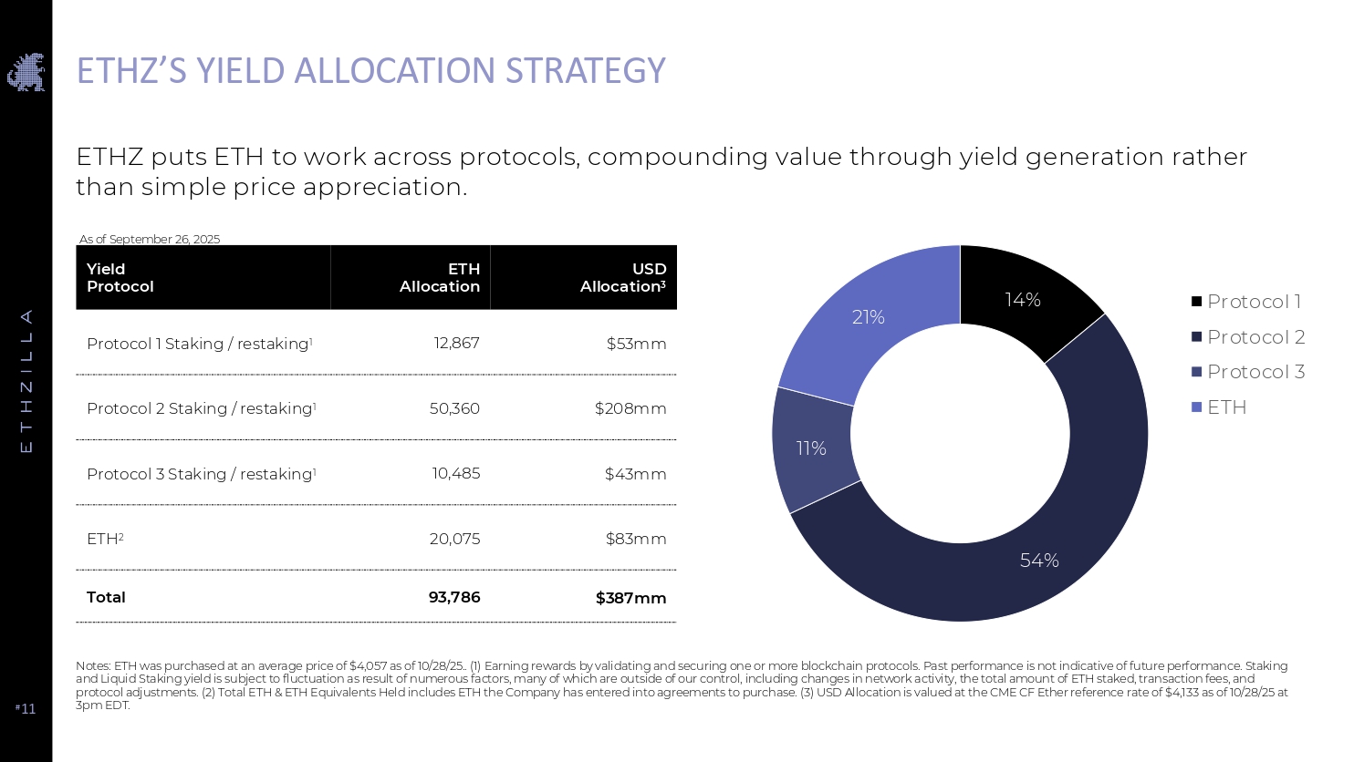 # 11 ETHZ’S YIELD ALLOCATION STRATEGY Notes: ETH was purchased at an average price of $4,057 as of 10/28/25.. (1) Earning rewards by validating and securing one or mo re blockchain protocols. Past performance is not indicative of future performance. Staking and Liquid Staking yield is subject to fluctuation as result of numerous factors, many of which are outside of our control, i ncl uding changes in network activity, the total amount of ETH staked, transaction fees, and protocol adjustments. (2) Total ETH & ETH Equivalents Held includes ETH the Company has entered into agreements to purchase. (3) USD Allocation is valued at the CME CF Ether reference rate of $4,133 as of 10/28/25 at 3pm EDT. ETHZ puts ETH to work across protocols, compounding value through yield generation rather than simple price appreciation. USD Allocation 3 ETH Allocation Yield Protocol $53mm 12,867 Protocol 1 Staking / restaking 1 $208mm 50,360 Protocol 2 Staking / restaking 1 $43mm 10,485 Protocol 3 Staking / restaking 1 $83mm 20,075 ETH 2 $387mm 93,786 Total 14% 54% 11% 21% Protocol 1 Protocol 2 Protocol 3 ETH As of September 26, 2025