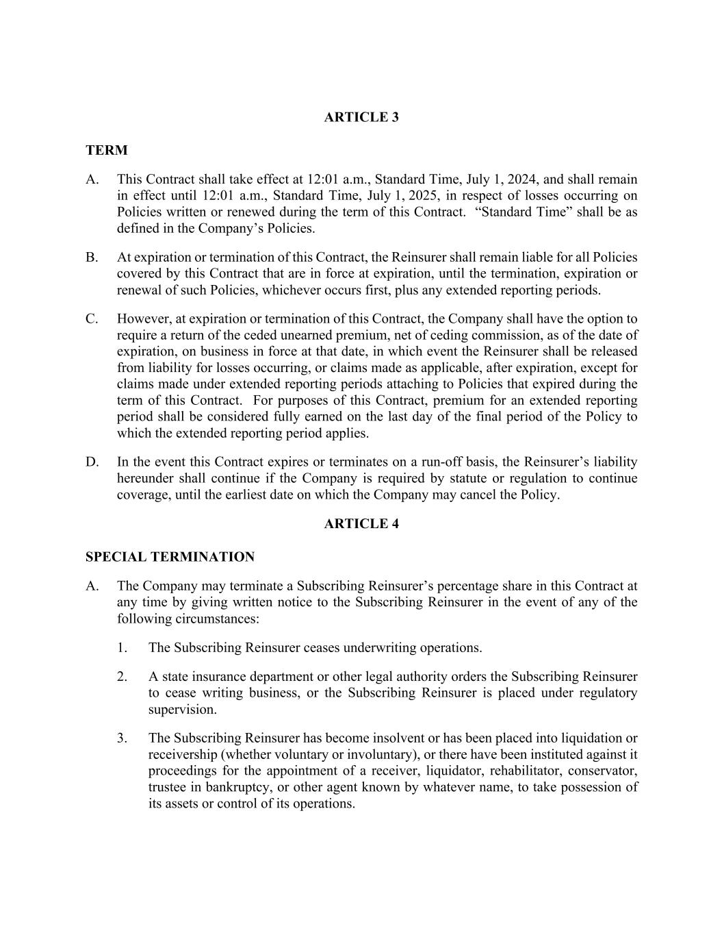 ARTICLE 3 TERM A. This Contract shall take effect at 12:01 a.m., Standard Time, July 1, 2024, and shall remain in effect until 12:01 a.m., Standard Time, July 1, 2025, in respect of losses occurring on Policies written or renewed during the term of this Contract. “Standard Time” shall be as defined in the Company’s Policies. B. At expiration or termination of this Contract, the Reinsurer shall remain liable for all Policies covered by this Contract that are in force at expiration, until the termination, expiration or renewal of such Policies, whichever occurs first, plus any extended reporting periods. C. However, at expiration or termination of this Contract, the Company shall have the option to require a return of the ceded unearned premium, net of ceding commission, as of the date of expiration, on business in force at that date, in which event the Reinsurer shall be released from liability for losses occurring, or claims made as applicable, after expiration, except for claims made under extended reporting periods attaching to Policies that expired during the term of this Contract. For purposes of this Contract, premium for an extended reporting period shall be considered fully earned on the last day of the final period of the Policy to which the extended reporting period applies. D. In the event this Contract expires or terminates on a run-off basis, the Reinsurer’s liability hereunder shall continue if the Company is required by statute or regulation to continue coverage, until the earliest date on which the Company may cancel the Policy. ARTICLE 4 SPECIAL TERMINATION A. The Company may terminate a Subscribing Reinsurer’s percentage share in this Contract at any time by giving written notice to the Subscribing Reinsurer in the event of any of the following circumstances: 1. The Subscribing Reinsurer ceases underwriting operations. 2. A state insurance department or other legal authority orders the Subscribing Reinsurer to cease writing business, or the Subscribing Reinsurer is placed under regulatory supervision. 3. The Subscribing Reinsurer has become insolvent or has been placed into liquidation or receivership (whether voluntary or involuntary), or there have been instituted against it proceedings for the appointment of a receiver, liquidator, rehabilitator, conservator, trustee in bankruptcy, or other agent known by whatever name, to take possession of its assets or control of its operations.
