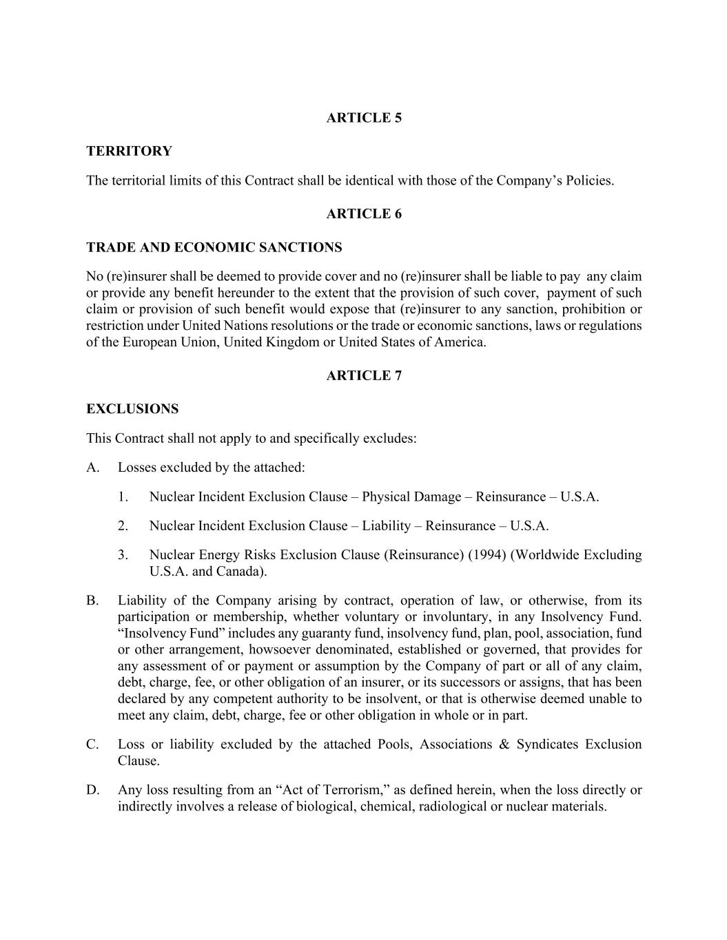ARTICLE 5 TERRITORY The territorial limits of this Contract shall be identical with those of the Company’s Policies. ARTICLE 6 TRADE AND ECONOMIC SANCTIONS No (re)insurer shall be deemed to provide cover and no (re)insurer shall be liable to pay any claim or provide any benefit hereunder to the extent that the provision of such cover, payment of such claim or provision of such benefit would expose that (re)insurer to any sanction, prohibition or restriction under United Nations resolutions or the trade or economic sanctions, laws or regulations of the European Union, United Kingdom or United States of America. ARTICLE 7 EXCLUSIONS This Contract shall not apply to and specifically excludes: A. Losses excluded by the attached: 1. Nuclear Incident Exclusion Clause – Physical Damage – Reinsurance – U.S.A. 2. Nuclear Incident Exclusion Clause – Liability – Reinsurance – U.S.A. 3. Nuclear Energy Risks Exclusion Clause (Reinsurance) (1994) (Worldwide Excluding U.S.A. and Canada). B. Liability of the Company arising by contract, operation of law, or otherwise, from its participation or membership, whether voluntary or involuntary, in any Insolvency Fund. “Insolvency Fund” includes any guaranty fund, insolvency fund, plan, pool, association, fund or other arrangement, howsoever denominated, established or governed, that provides for any assessment of or payment or assumption by the Company of part or all of any claim, debt, charge, fee, or other obligation of an insurer, or its successors or assigns, that has been declared by any competent authority to be insolvent, or that is otherwise deemed unable to meet any claim, debt, charge, fee or other obligation in whole or in part. C. Loss or liability excluded by the attached Pools, Associations & Syndicates Exclusion Clause. D. Any loss resulting from an “Act of Terrorism,” as defined herein, when the loss directly or indirectly involves a release of biological, chemical, radiological or nuclear materials.