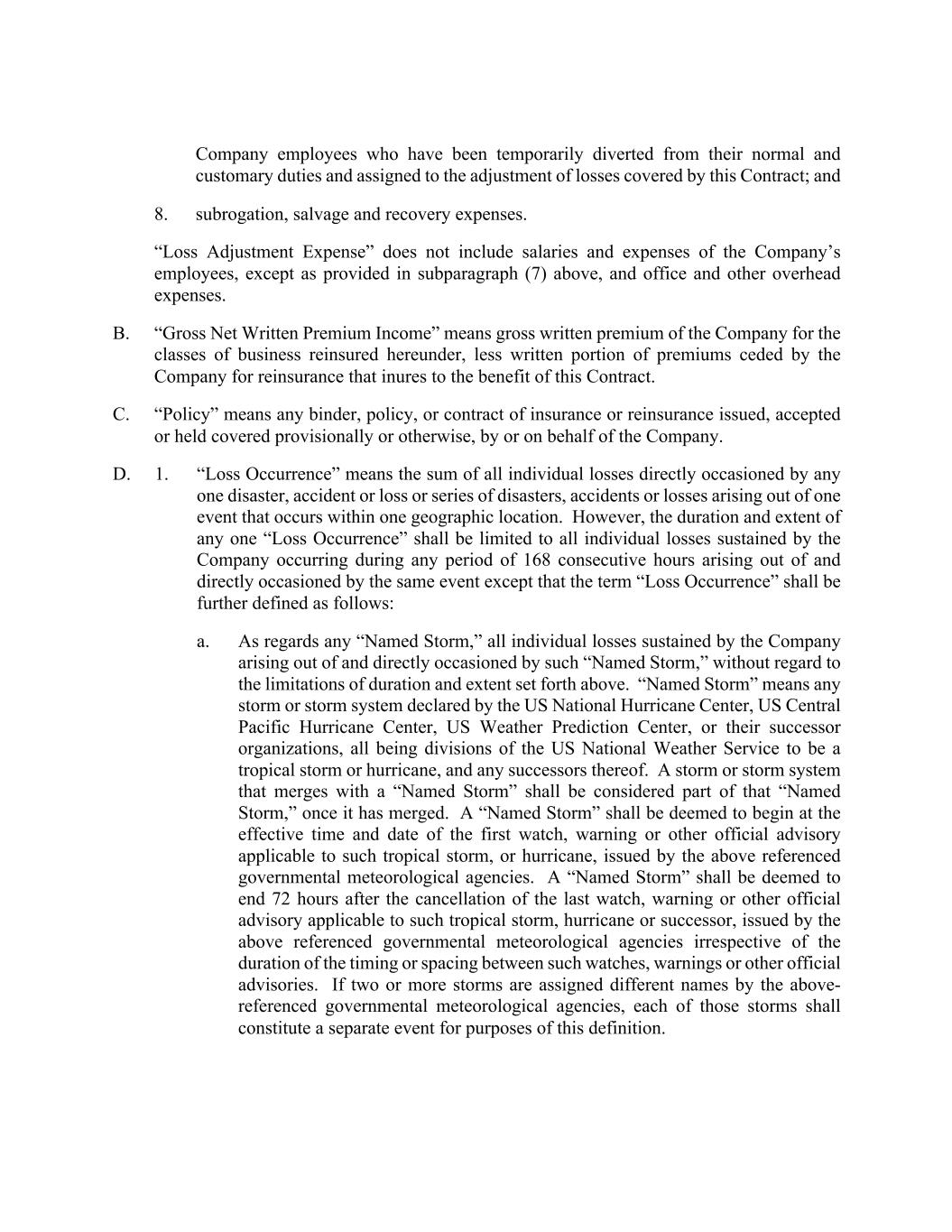 Company employees who have been temporarily diverted from their normal and customary duties and assigned to the adjustment of losses covered by this Contract; and 8. subrogation, salvage and recovery expenses. “Loss Adjustment Expense” does not include salaries and expenses of the Company’s employees, except as provided in subparagraph (7) above, and office and other overhead expenses. B. “Gross Net Written Premium Income” means gross written premium of the Company for the classes of business reinsured hereunder, less written portion of premiums ceded by the Company for reinsurance that inures to the benefit of this Contract. C. “Policy” means any binder, policy, or contract of insurance or reinsurance issued, accepted or held covered provisionally or otherwise, by or on behalf of the Company. D. 1. “Loss Occurrence” means the sum of all individual losses directly occasioned by any one disaster, accident or loss or series of disasters, accidents or losses arising out of one event that occurs within one geographic location. However, the duration and extent of any one “Loss Occurrence” shall be limited to all individual losses sustained by the Company occurring during any period of 168 consecutive hours arising out of and directly occasioned by the same event except that the term “Loss Occurrence” shall be further defined as follows: a. As regards any “Named Storm,” all individual losses sustained by the Company arising out of and directly occasioned by such “Named Storm,” without regard to the limitations of duration and extent set forth above. “Named Storm” means any storm or storm system declared by the US National Hurricane Center, US Central Pacific Hurricane Center, US Weather Prediction Center, or their successor organizations, all being divisions of the US National Weather Service to be a tropical storm or hurricane, and any successors thereof. A storm or storm system that merges with a “Named Storm” shall be considered part of that “Named Storm,” once it has merged. A “Named Storm” shall be deemed to begin at the effective time and date of the first watch, warning or other official advisory applicable to such tropical storm, or hurricane, issued by the above referenced governmental meteorological agencies. A “Named Storm” shall be deemed to end 72 hours after the cancellation of the last watch, warning or other official advisory applicable to such tropical storm, hurricane or successor, issued by the above referenced governmental meteorological agencies irrespective of the duration of the timing or spacing between such watches, warnings or other official advisories. If two or more storms are assigned different names by the above- referenced governmental meteorological agencies, each of those storms shall constitute a separate event for purposes of this definition.