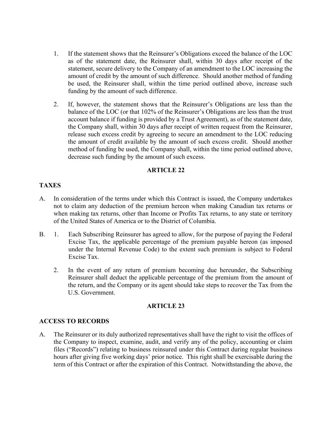 1. If the statement shows that the Reinsurer’s Obligations exceed the balance of the LOC as of the statement date, the Reinsurer shall, within 30 days after receipt of the statement, secure delivery to the Company of an amendment to the LOC increasing the amount of credit by the amount of such difference. Should another method of funding be used, the Reinsurer shall, within the time period outlined above, increase such funding by the amount of such difference. 2. If, however, the statement shows that the Reinsurer’s Obligations are less than the balance of the LOC (or that 102% of the Reinsurer’s Obligations are less than the trust account balance if funding is provided by a Trust Agreement), as of the statement date, the Company shall, within 30 days after receipt of written request from the Reinsurer, release such excess credit by agreeing to secure an amendment to the LOC reducing the amount of credit available by the amount of such excess credit. Should another method of funding be used, the Company shall, within the time period outlined above, decrease such funding by the amount of such excess. ARTICLE 22 TAXES A. In consideration of the terms under which this Contract is issued, the Company undertakes not to claim any deduction of the premium hereon when making Canadian tax returns or when making tax returns, other than Income or Profits Tax returns, to any state or territory of the United States of America or to the District of Columbia. B. 1. Each Subscribing Reinsurer has agreed to allow, for the purpose of paying the Federal Excise Tax, the applicable percentage of the premium payable hereon (as imposed under the Internal Revenue Code) to the extent such premium is subject to Federal Excise Tax. 2. In the event of any return of premium becoming due hereunder, the Subscribing Reinsurer shall deduct the applicable percentage of the premium from the amount of the return, and the Company or its agent should take steps to recover the Tax from the U.S. Government. ARTICLE 23 ACCESS TO RECORDS A. The Reinsurer or its duly authorized representatives shall have the right to visit the offices of the Company to inspect, examine, audit, and verify any of the policy, accounting or claim files (“Records”) relating to business reinsured under this Contract during regular business hours after giving five working days’ prior notice. This right shall be exercisable during the term of this Contract or after the expiration of this Contract. Notwithstanding the above, the