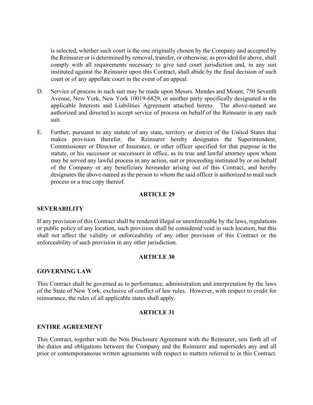 is selected, whether such court is the one originally chosen by the Company and accepted by the Reinsurer or is determined by removal, transfer, or otherwise, as provided for above, shall comply with all requirements necessary to give said court jurisdiction and, in any suit instituted against the Reinsurer upon this Contract, shall abide by the final decision of such court or of any appellate court in the event of an appeal. D. Service of process in such suit may be made upon Messrs. Mendes and Mount, 750 Seventh Avenue, New York, New York 10019-6829, or another party specifically designated in the applicable Interests and Liabilities Agreement attached hereto. The above-named are authorized and directed to accept service of process on behalf of the Reinsurer in any such suit. E. Further, pursuant to any statute of any state, territory or district of the United States that makes provision therefor, the Reinsurer hereby designates the Superintendent, Commissioner or Director of Insurance, or other officer specified for that purpose in the statute, or his successor or successors in office, as its true and lawful attorney upon whom may be served any lawful process in any action, suit or proceeding instituted by or on behalf of the Company or any beneficiary hereunder arising out of this Contract, and hereby designates the above-named as the person to whom the said officer is authorized to mail such process or a true copy thereof. ARTICLE 29 SEVERABILITY If any provision of this Contract shall be rendered illegal or unenforceable by the laws, regulations or public policy of any location, such provision shall be considered void in such location, but this shall not affect the validity or enforceability of any other provision of this Contract or the enforceability of such provision in any other jurisdiction. ARTICLE 30 GOVERNING LAW This Contract shall be governed as to performance, administration and interpretation by the laws of the State of New York, exclusive of conflict of law rules. However, with respect to credit for reinsurance, the rules of all applicable states shall apply. ARTICLE 31 ENTIRE AGREEMENT This Contract, together with the Non Disclosure Agreement with the Reinsurer, sets forth all of the duties and obligations between the Company and the Reinsurer and supersedes any and all prior or contemporaneous written agreements with respect to matters referred to in this Contract.