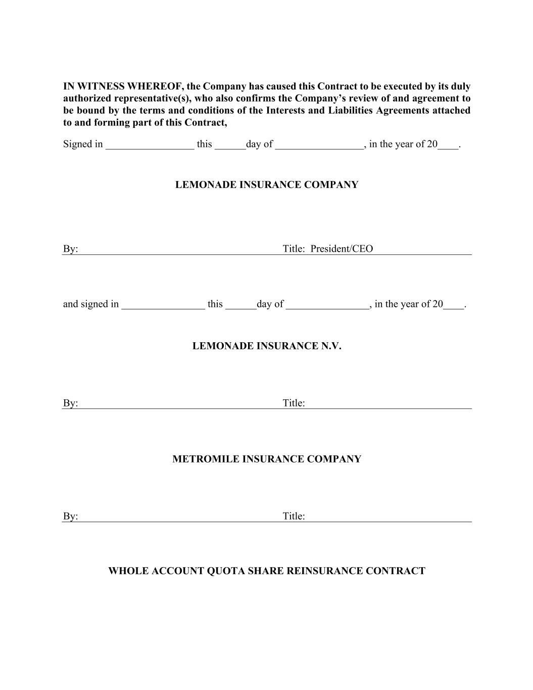 IN WITNESS WHEREOF, the Company has caused this Contract to be executed by its duly authorized representative(s), who also confirms the Company’s review of and agreement to be bound by the terms and conditions of the Interests and Liabilities Agreements attached to and forming part of this Contract, Signed in _________________ this ______day of _________________, in the year of 20____. LEMONADE INSURANCE COMPANY By: Title: President/CEO and signed in ________________ this ______day of ________________, in the year of 20____. LEMONADE INSURANCE N.V. By: Title: METROMILE INSURANCE COMPANY By: Title: WHOLE ACCOUNT QUOTA SHARE REINSURANCE CONTRACT