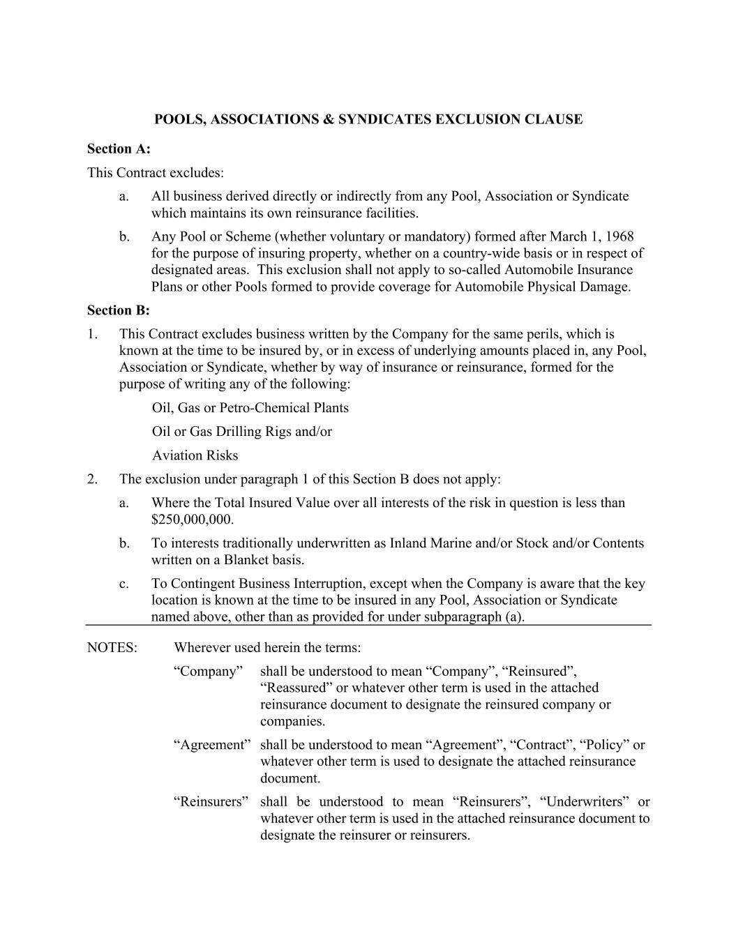 POOLS, ASSOCIATIONS & SYNDICATES EXCLUSION CLAUSE Section A: This Contract excludes: a. All business derived directly or indirectly from any Pool, Association or Syndicate which maintains its own reinsurance facilities. b. Any Pool or Scheme (whether voluntary or mandatory) formed after March 1, 1968 for the purpose of insuring property, whether on a country-wide basis or in respect of designated areas. This exclusion shall not apply to so-called Automobile Insurance Plans or other Pools formed to provide coverage for Automobile Physical Damage. Section B: 1. This Contract excludes business written by the Company for the same perils, which is known at the time to be insured by, or in excess of underlying amounts placed in, any Pool, Association or Syndicate, whether by way of insurance or reinsurance, formed for the purpose of writing any of the following: Oil, Gas or Petro-Chemical Plants Oil or Gas Drilling Rigs and/or Aviation Risks 2. The exclusion under paragraph 1 of this Section B does not apply: a. Where the Total Insured Value over all interests of the risk in question is less than $250,000,000. b. To interests traditionally underwritten as Inland Marine and/or Stock and/or Contents written on a Blanket basis. c. To Contingent Business Interruption, except when the Company is aware that the key location is known at the time to be insured in any Pool, Association or Syndicate named above, other than as provided for under subparagraph (a). NOTES: Wherever used herein the terms: “Company” shall be understood to mean “Company”, “Reinsured”, “Reassured” or whatever other term is used in the attached reinsurance document to designate the reinsured company or companies. “Agreement” shall be understood to mean “Agreement”, “Contract”, “Policy” or whatever other term is used to designate the attached reinsurance document. “Reinsurers” shall be understood to mean “Reinsurers”, “Underwriters” or whatever other term is used in the attached reinsurance document to designate the reinsurer or reinsurers.