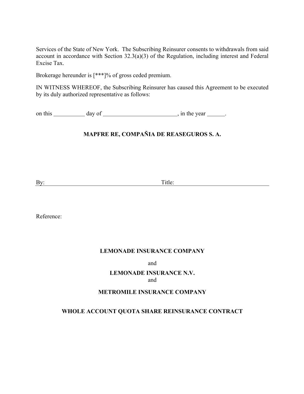 Services of the State of New York. The Subscribing Reinsurer consents to withdrawals from said account in accordance with Section 32.3(a)(3) of the Regulation, including interest and Federal Excise Tax. Brokerage hereunder is [***]% of gross ceded premium. IN WITNESS WHEREOF, the Subscribing Reinsurer has caused this Agreement to be executed by its duly authorized representative as follows: on this day of , in the year . MAPFRE RE, COMPAÑIA DE REASEGUROS S. A. By: Title: Reference: LEMONADE INSURANCE COMPANY and LEMONADE INSURANCE N.V. and METROMILE INSURANCE COMPANY WHOLE ACCOUNT QUOTA SHARE REINSURANCE CONTRACT