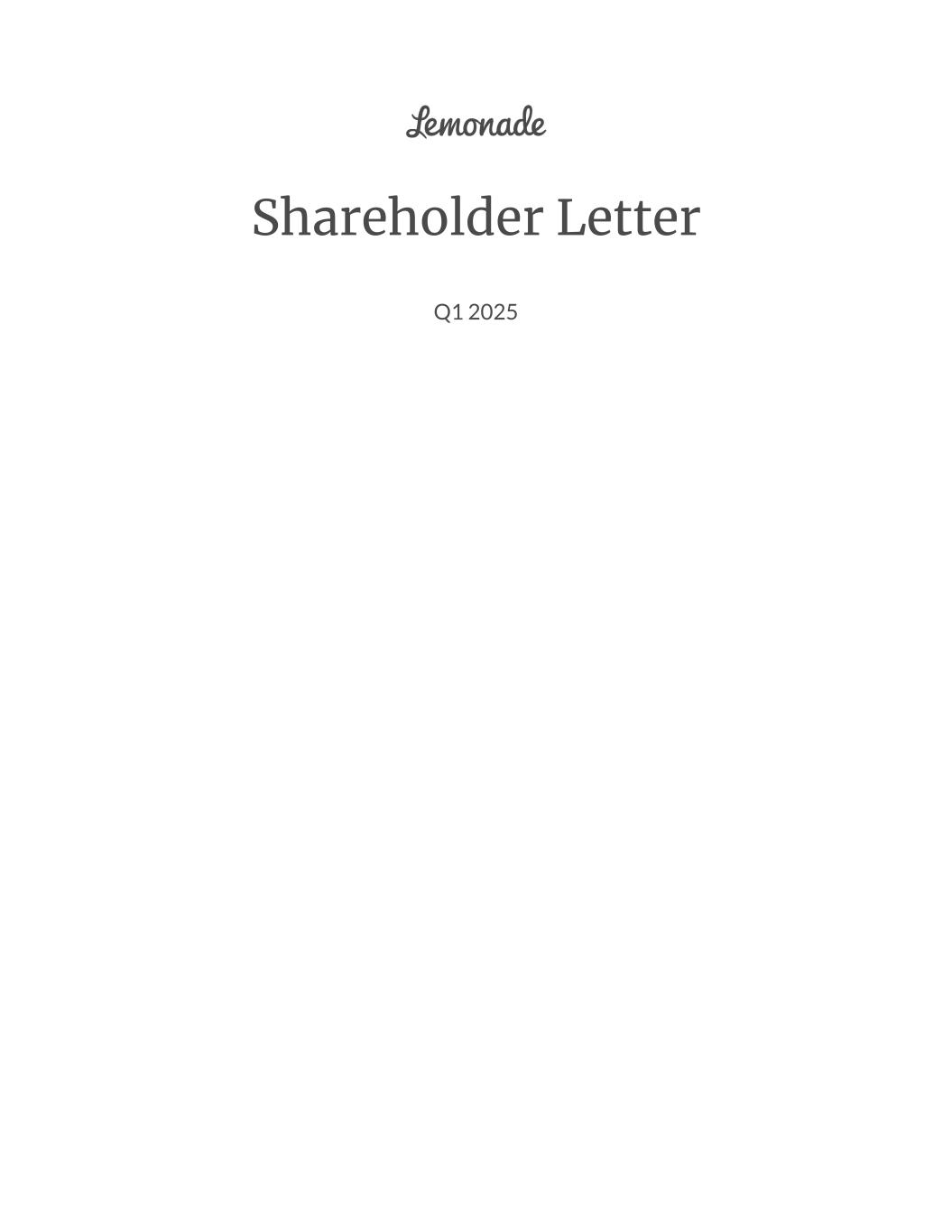 Links The information contained on, or that can be accessed through, hyperlinks included herein is deemed not to be incorporated in or part of this shareholder letter. Earnings teleconference information The Company will discuss its first quarter 2025 financial results and business outlook during a teleconference on May 6, 2025, at 8:00 AM ET. The conference call (access code 331560) can be accessed toll-free at 833-470-1428 or at 404-975-4839. A live audio webcast of the call will be available simultaneously at https:// www.lemonade.com/investor Following completion of the call, a recorded replay of the webcast will be available on the investor relations section of Lemonade’s website. Additional investor information can be accessed at https://www.lemonade.com/investor About Lemonade Lemonade offers renters, homeowners, pet, car, and life insurance. Powered by artificial intelligence and behavioral economics, Lemonade’s full stack insurance carriers in the US, the UK and Europe replace brokers and bureaucracy with bots and machine learning, aiming for zero paperwork and instant everything. A Certified B-Corp, Lemonade donates to nonprofits selected by its community, during its annual Giveback. Lemonade is currently available in the United States, the UK, Germany, the Netherlands, and France, and continues to expand globally. For more information, please visit www.lemonade.com, and follow Lemonade on X or Instagram. Media inquiries: press@lemonade.com Investor contact: ir@lemonade.com 16