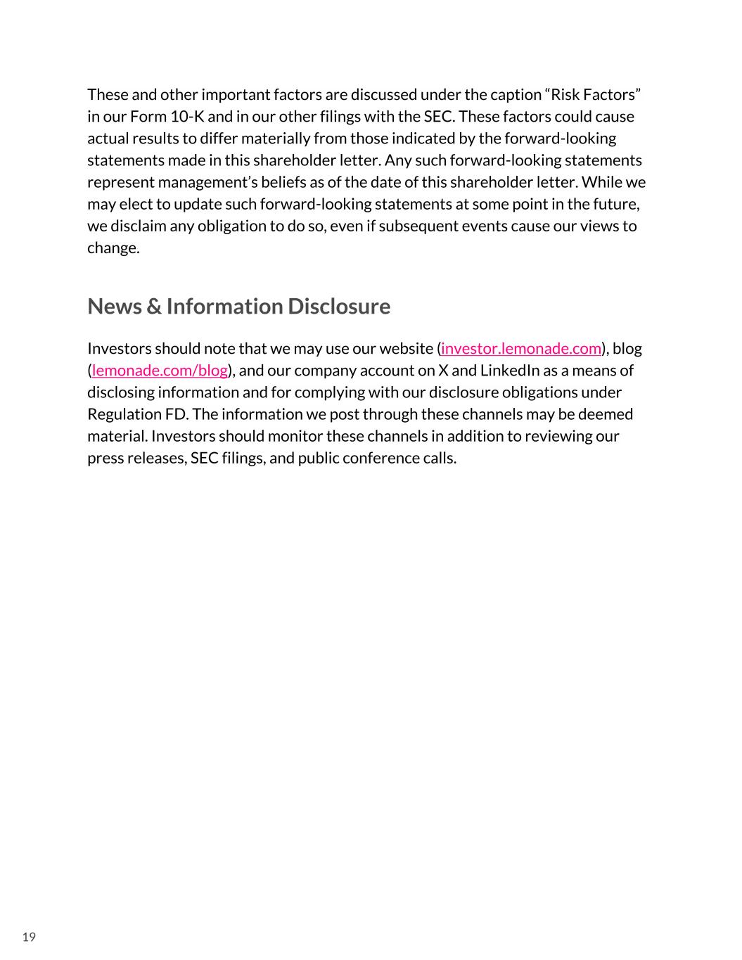 These and other important factors are discussed under the caption “Risk Factors” in our Form 10-K and in our other filings with the SEC. These factors could cause actual results to differ materially from those indicated by the forward-looking statements made in this shareholder letter. Any such forward-looking statements represent management’s beliefs as of the date of this shareholder letter. While we may elect to update such forward-looking statements at some point in the future, we disclaim any obligation to do so, even if subsequent events cause our views to change. News & Information Disclosure Investors should note that we may use our website (investor.lemonade.com), blog (lemonade.com/blog), and our company account on X and LinkedIn as a means of disclosing information and for complying with our disclosure obligations under Regulation FD. The information we post through these channels may be deemed material. Investors should monitor these channels in addition to reviewing our press releases, SEC filings, and public conference calls. 19