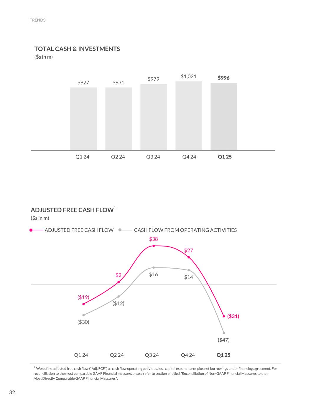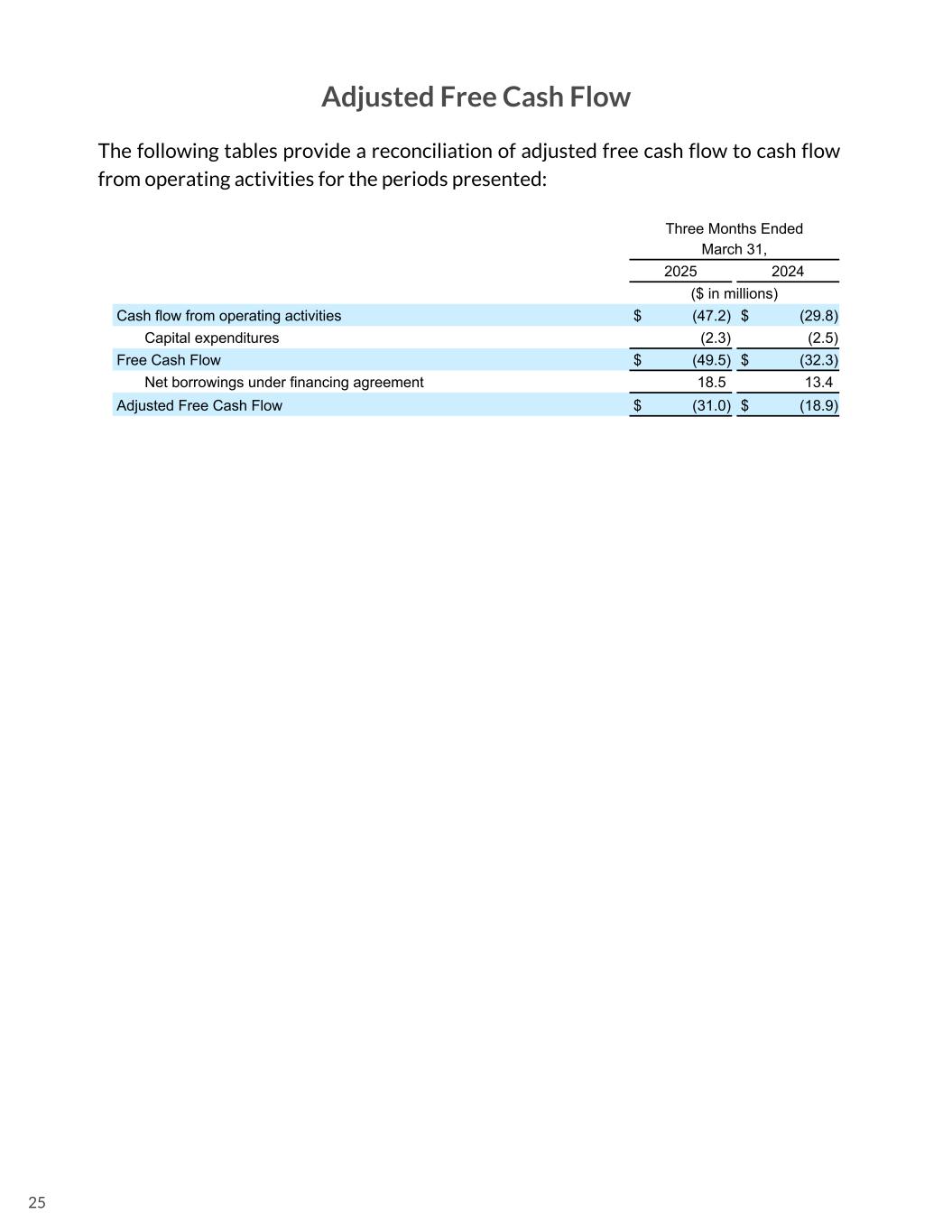 Adjusted Free Cash Flow The following tables provide a reconciliation of adjusted free cash flow to cash flow from operating activities for the periods presented: Three Months Ended March 31, 2025 2024 ($ in millions) Cash flow from operating activities $ (47.2) $ (29.8) Capital expenditures (2.3) (2.5) Free Cash Flow $ (49.5) $ (32.3) Net borrowings under financing agreement 18.5 13.4 Adjusted Free Cash Flow $ (31.0) $ (18.9) 25