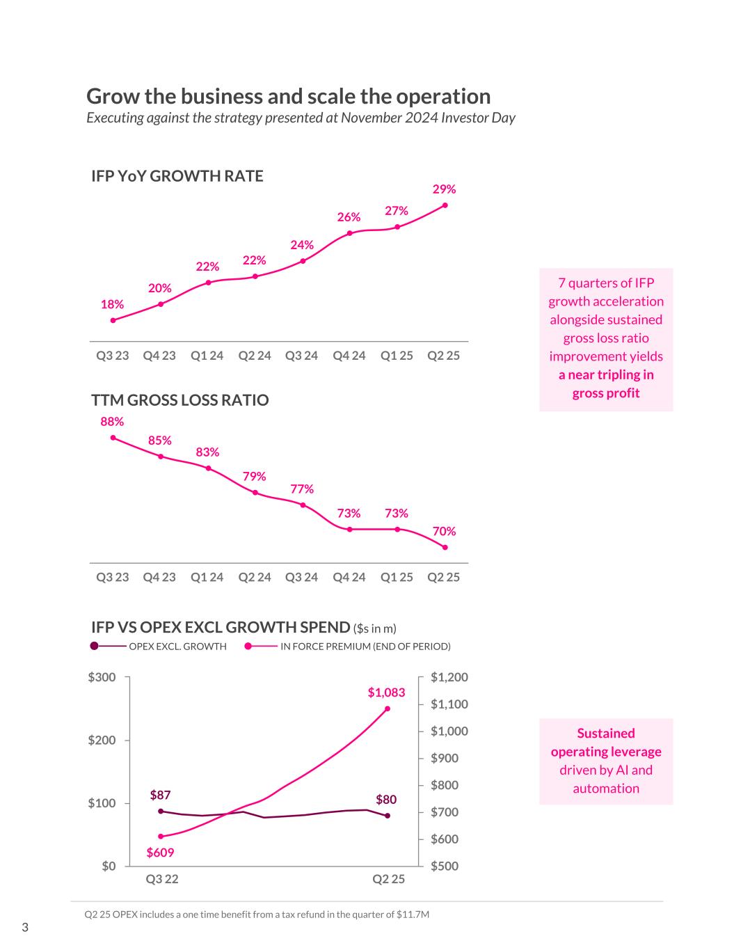 Dear Shareholders, Our second quarter results were very strong, once again headlined by accelerating growth, healthy underwriting performance, and excellence in expense management. The quarter saw momentum continue to build in two of our high potential growth engines – Car and Europe, which we’ll dive into in a bit more detail. Looking ahead, we have raised full year 2025 IFP, GEP, and Revenue guidance while reiterating full year 2025 Adj. EBITDA guidance. Here’s a look at the key metrics: • Top Line: At $1.08 billion, In Force Premium grew 29% YoY – our seventh consecutive quarter of growth acceleration – while Revenue grew 35%. • Loss Ratio: Trailing twelve months (“TTM”) gross loss ratio improved by 3 points sequentially to 70%, comfortably in line with our target range. Our second quarter gross loss ratio of 67% was 12 points improved relative to the prior year. • Gross Profit: Increased by 109% year on year to $64.3 million, while gross margin improved by 14 points to 39%. • Operating Expenses: Increased by $23 million, or 21%, primarily driven by a $24 million, or 93% increase, in growth spend, consistent with our accelerating growth plan. Excluding growth spend, operating expenses declined by $1 million, or 2%, vs. the prior year. • Bottom Line: Adj. EBITDA loss of ($41) million was 5% improved relative to prior year, in line with our guidance. Net Loss in the quarter was ($44) million, 23% improved relative to prior year. • Cash Flow: Generated $25 million of Adj. Free Cash Flow in the second quarter, an increase of $23 million relative to prior year. Cash flow from operations was $6 million in the second quarter, an increase of $17 million relative to prior year. 2
