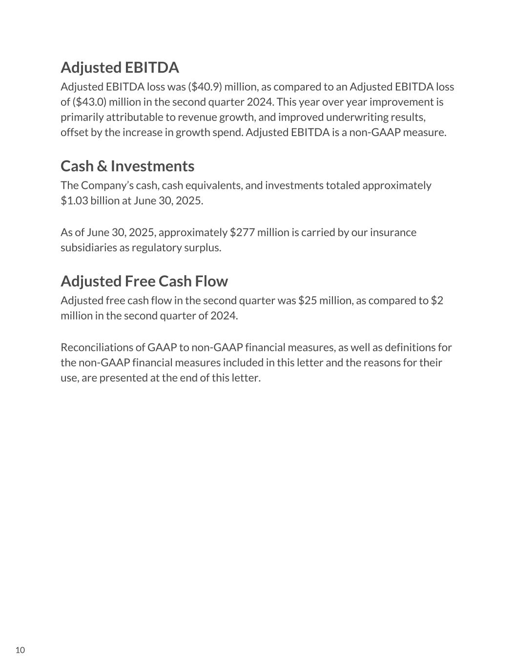 Adjusted EBITDA Adjusted EBITDA loss was ($40.9) million, as compared to an Adjusted EBITDA loss of ($43.0) million in the second quarter 2024. This year over year improvement is primarily attributable to revenue growth, and improved underwriting results, offset by the increase in growth spend. Adjusted EBITDA is a non-GAAP measure. Cash & Investments The Company’s cash, cash equivalents, and investments totaled approximately $1.03 billion at June 30, 2025. As of June 30, 2025, approximately $277 million is carried by our insurance subsidiaries as regulatory surplus. Adjusted Free Cash Flow Adjusted free cash flow in the second quarter was $25 million, as compared to $2 million in the second quarter of 2024. Reconciliations of GAAP to non-GAAP financial measures, as well as definitions for the non-GAAP financial measures included in this letter and the reasons for their use, are presented at the end of this letter. 10
