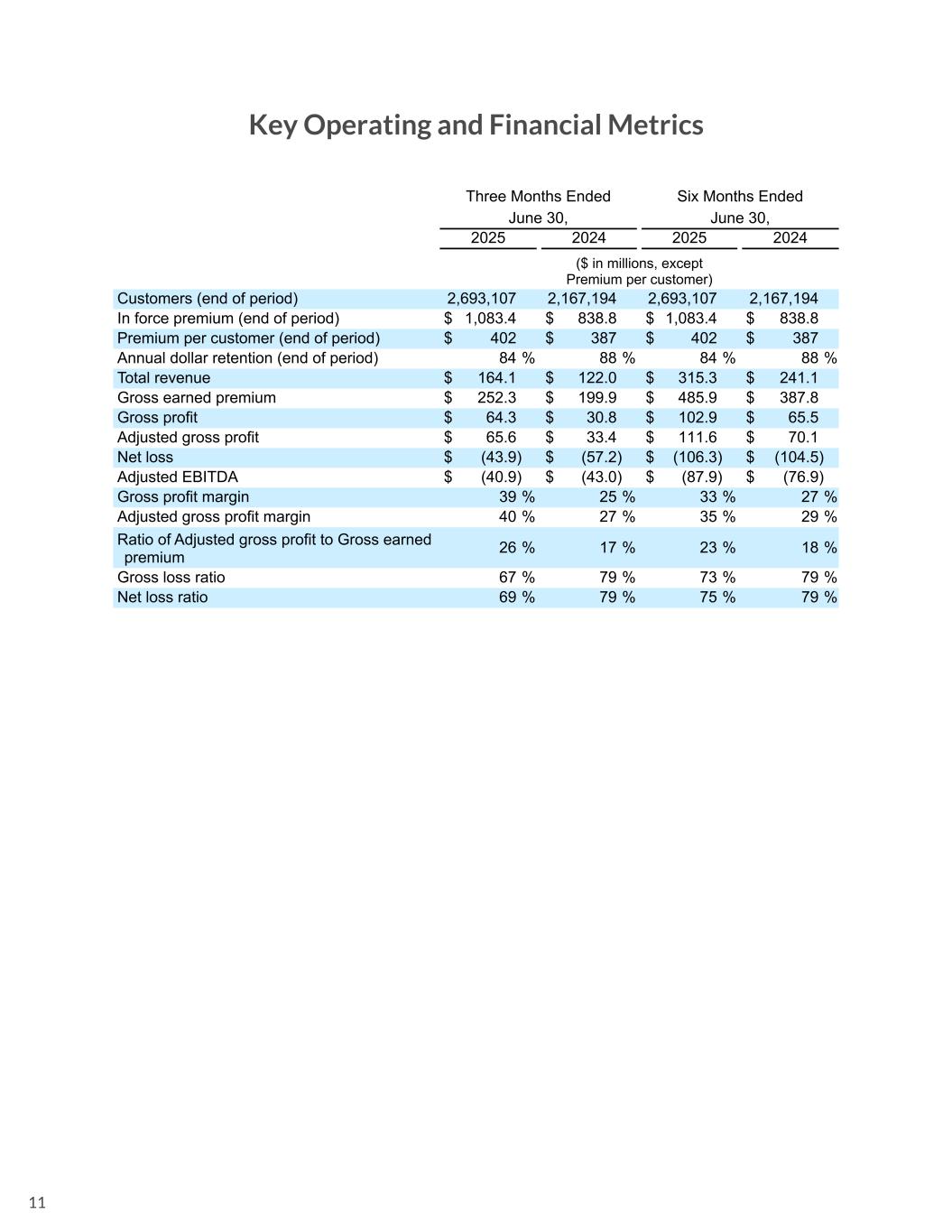 Key Operating and Financial Metrics Three Months Ended June 30, Six Months Ended June 30, 2025 2024 2025 2024 ($ in millions, except Premium per customer) Customers (end of period) 2,693,107 2,167,194 2,693,107 2,167,194 In force premium (end of period) $ 1,083.4 $ 838.8 $ 1,083.4 $ 838.8 Premium per customer (end of period) $ 402 $ 387 $ 402 $ 387 Annual dollar retention (end of period) 84 % 88 % 84 % 88 % Total revenue $ 164.1 $ 122.0 $ 315.3 $ 241.1 Gross earned premium $ 252.3 $ 199.9 $ 485.9 $ 387.8 Gross profit $ 64.3 $ 30.8 $ 102.9 $ 65.5 Adjusted gross profit $ 65.6 $ 33.4 $ 111.6 $ 70.1 Net loss $ (43.9) $ (57.2) $ (106.3) $ (104.5) Adjusted EBITDA $ (40.9) $ (43.0) $ (87.9) $ (76.9) Gross profit margin 39 % 25 % 33 % 27 % Adjusted gross profit margin 40 % 27 % 35 % 29 % Ratio of Adjusted gross profit to Gross earned premium 26 % 17 % 23 % 18 % Gross loss ratio 67 % 79 % 73 % 79 % Net loss ratio 69 % 79 % 75 % 79 % 11