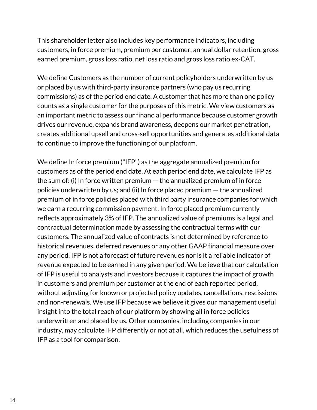 This shareholder letter also includes key performance indicators, including customers, in force premium, premium per customer, annual dollar retention, gross earned premium, gross loss ratio, net loss ratio and gross loss ratio ex-CAT. We define Customers as the number of current policyholders underwritten by us or placed by us with third-party insurance partners (who pay us recurring commissions) as of the period end date. A customer that has more than one policy counts as a single customer for the purposes of this metric. We view customers as an important metric to assess our financial performance because customer growth drives our revenue, expands brand awareness, deepens our market penetration, creates additional upsell and cross-sell opportunities and generates additional data to continue to improve the functioning of our platform. We define In force premium ("IFP") as the aggregate annualized premium for customers as of the period end date. At each period end date, we calculate IFP as the sum of: (i) In force written premium — the annualized premium of in force policies underwritten by us; and (ii) In force placed premium — the annualized premium of in force policies placed with third party insurance companies for which we earn a recurring commission payment. In force placed premium currently reflects approximately 3% of IFP. The annualized value of premiums is a legal and contractual determination made by assessing the contractual terms with our customers. The annualized value of contracts is not determined by reference to historical revenues, deferred revenues or any other GAAP financial measure over any period. IFP is not a forecast of future revenues nor is it a reliable indicator of revenue expected to be earned in any given period. We believe that our calculation of IFP is useful to analysts and investors because it captures the impact of growth in customers and premium per customer at the end of each reported period, without adjusting for known or projected policy updates, cancellations, rescissions and non-renewals. We use IFP because we believe it gives our management useful insight into the total reach of our platform by showing all in force policies underwritten and placed by us. Other companies, including companies in our industry, may calculate IFP differently or not at all, which reduces the usefulness of IFP as a tool for comparison. 14