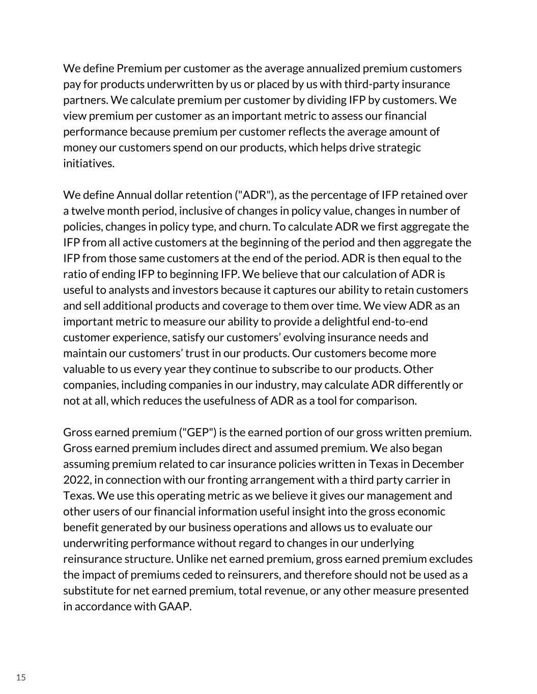 We define Premium per customer as the average annualized premium customers pay for products underwritten by us or placed by us with third-party insurance partners. We calculate premium per customer by dividing IFP by customers. We view premium per customer as an important metric to assess our financial performance because premium per customer reflects the average amount of money our customers spend on our products, which helps drive strategic initiatives. We define Annual dollar retention ("ADR"), as the percentage of IFP retained over a twelve month period, inclusive of changes in policy value, changes in number of policies, changes in policy type, and churn. To calculate ADR we first aggregate the IFP from all active customers at the beginning of the period and then aggregate the IFP from those same customers at the end of the period. ADR is then equal to the ratio of ending IFP to beginning IFP. We believe that our calculation of ADR is useful to analysts and investors because it captures our ability to retain customers and sell additional products and coverage to them over time. We view ADR as an important metric to measure our ability to provide a delightful end-to-end customer experience, satisfy our customers’ evolving insurance needs and maintain our customers’ trust in our products. Our customers become more valuable to us every year they continue to subscribe to our products. Other companies, including companies in our industry, may calculate ADR differently or not at all, which reduces the usefulness of ADR as a tool for comparison. Gross earned premium ("GEP") is the earned portion of our gross written premium. Gross earned premium includes direct and assumed premium. We also began assuming premium related to car insurance policies written in Texas in December 2022, in connection with our fronting arrangement with a third party carrier in Texas. We use this operating metric as we believe it gives our management and other users of our financial information useful insight into the gross economic benefit generated by our business operations and allows us to evaluate our underwriting performance without regard to changes in our underlying reinsurance structure. Unlike net earned premium, gross earned premium excludes the impact of premiums ceded to reinsurers, and therefore should not be used as a substitute for net earned premium, total revenue, or any other measure presented in accordance with GAAP. 15
