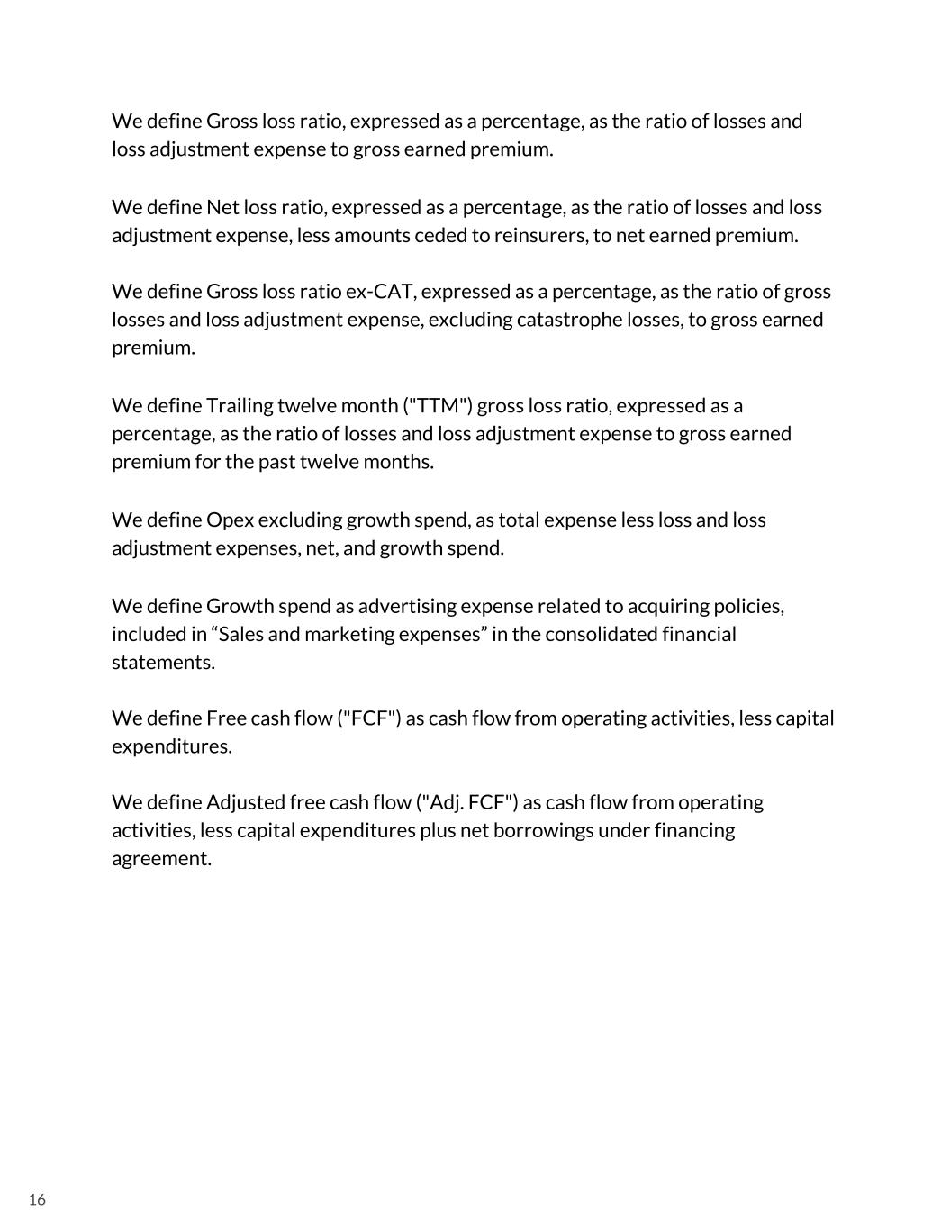 We define Gross loss ratio, expressed as a percentage, as the ratio of losses and loss adjustment expense to gross earned premium. We define Net loss ratio, expressed as a percentage, as the ratio of losses and loss adjustment expense, less amounts ceded to reinsurers, to net earned premium. We define Gross loss ratio ex-CAT, expressed as a percentage, as the ratio of gross losses and loss adjustment expense, excluding catastrophe losses, to gross earned premium. We define Trailing twelve month ("TTM") gross loss ratio, expressed as a percentage, as the ratio of losses and loss adjustment expense to gross earned premium for the past twelve months. We define Opex excluding growth spend, as total expense less loss and loss adjustment expenses, net, and growth spend. We define Growth spend as advertising expense related to acquiring policies, included in “Sales and marketing expenses” in the consolidated financial statements. We define Free cash flow ("FCF") as cash flow from operating activities, less capital expenditures. We define Adjusted free cash flow ("Adj. FCF") as cash flow from operating activities, less capital expenditures plus net borrowings under financing agreement. 16