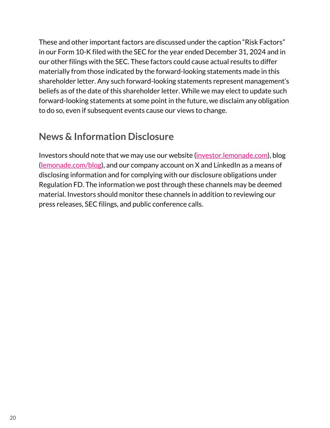These and other important factors are discussed under the caption “Risk Factors” in our Form 10-K filed with the SEC for the year ended December 31, 2024 and in our other filings with the SEC. These factors could cause actual results to differ materially from those indicated by the forward-looking statements made in this shareholder letter. Any such forward-looking statements represent management’s beliefs as of the date of this shareholder letter. While we may elect to update such forward-looking statements at some point in the future, we disclaim any obligation to do so, even if subsequent events cause our views to change. News & Information Disclosure Investors should note that we may use our website (investor.lemonade.com), blog (lemonade.com/blog), and our company account on X and LinkedIn as a means of disclosing information and for complying with our disclosure obligations under Regulation FD. The information we post through these channels may be deemed material. Investors should monitor these channels in addition to reviewing our press releases, SEC filings, and public conference calls. 20