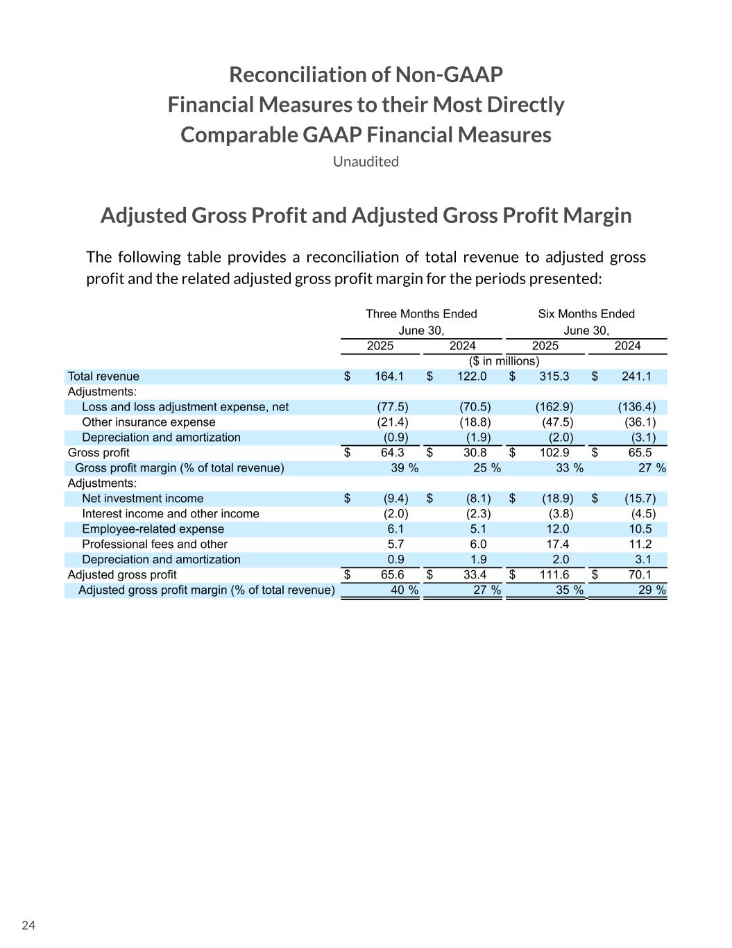 Reconciliation of Non-GAAP Financial Measures to their Most Directly Comparable GAAP Financial Measures Unaudited Adjusted Gross Profit and Adjusted Gross Profit Margin The following table provides a reconciliation of total revenue to adjusted gross profit and the related adjusted gross profit margin for the periods presented: Three Months Ended June 30, Six Months Ended June 30, 2025 2024 2025 2024 ($ in millions) Total revenue $ 164.1 $ 122.0 $ 315.3 $ 241.1 Adjustments: Loss and loss adjustment expense, net (77.5) (70.5) (162.9) (136.4) Other insurance expense (21.4) (18.8) (47.5) (36.1) Depreciation and amortization (0.9) (1.9) (2.0) (3.1) Gross profit $ 64.3 $ 30.8 $ 102.9 $ 65.5 Gross profit margin (% of total revenue) 39 % 25 % 33 % 27 % Adjustments: Net investment income $ (9.4) $ (8.1) $ (18.9) $ (15.7) Interest income and other income (2.0) (2.3) (3.8) (4.5) Employee-related expense 6.1 5.1 12.0 10.5 Professional fees and other 5.7 6.0 17.4 11.2 Depreciation and amortization 0.9 1.9 2.0 3.1 Adjusted gross profit $ 65.6 $ 33.4 $ 111.6 $ 70.1 Adjusted gross profit margin (% of total revenue) 40 % 27 % 35 % 29 % 24