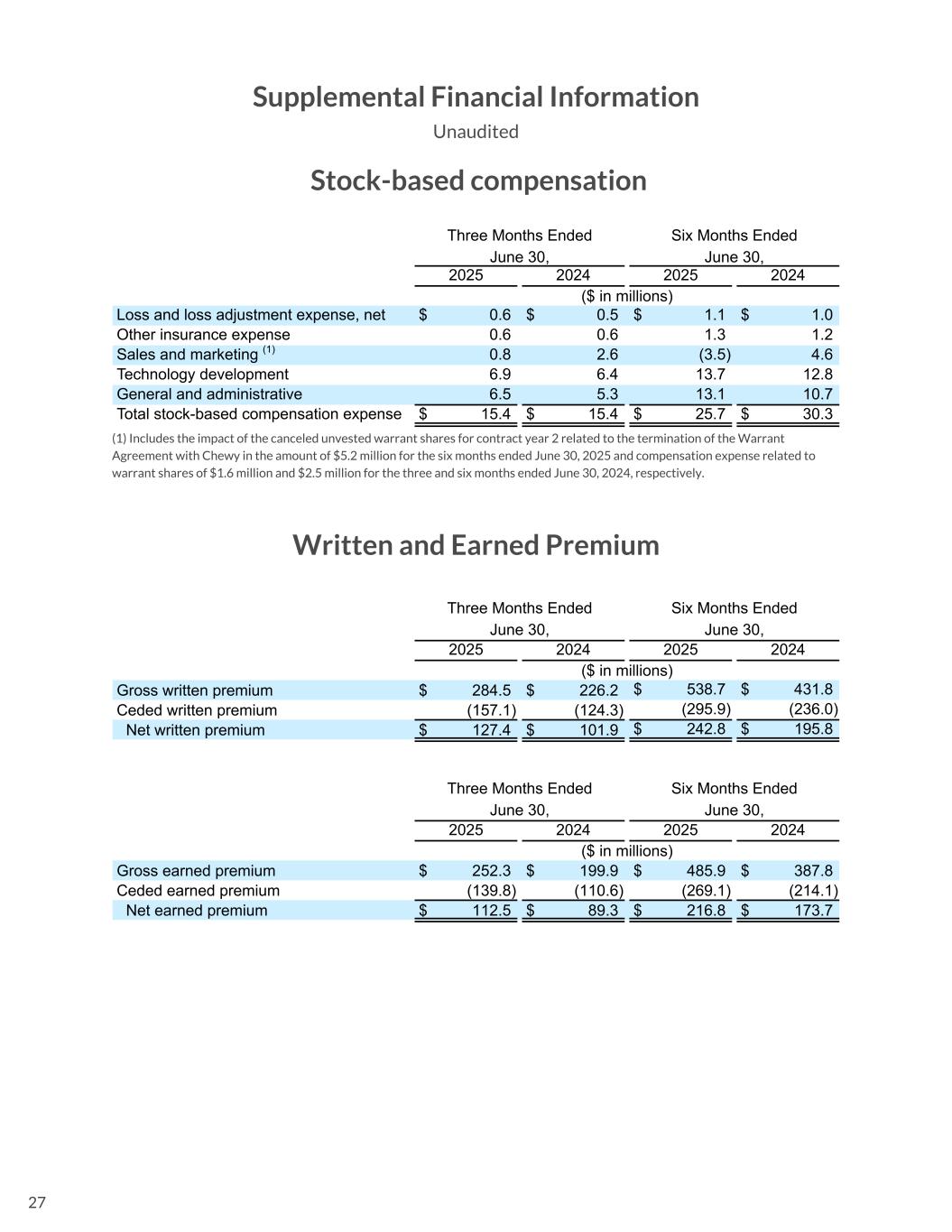 Supplemental Financial Information Unaudited Stock-based compensation Three Months Ended June 30, Six Months Ended June 30, 2025 2024 2025 2024 ($ in millions) Loss and loss adjustment expense, net $ 0.6 $ 0.5 $ 1.1 $ 1.0 Other insurance expense 0.6 0.6 1.3 1.2 Sales and marketing (1) 0.8 2.6 (3.5) 4.6 Technology development 6.9 6.4 13.7 12.8 General and administrative 6.5 5.3 13.1 10.7 Total stock-based compensation expense $ 15.4 $ 15.4 $ 25.7 $ 30.3 (1) Includes the impact of the canceled unvested warrant shares for contract year 2 related to the termination of the Warrant Agreement with Chewy in the amount of $5.2 million for the six months ended June 30, 2025 and compensation expense related to warrant shares of $1.6 million and $2.5 million for the three and six months ended June 30, 2024, respectively. Written and Earned Premium Three Months Ended June 30, Six Months Ended June 30, 2025 2024 2025 2024 ($ in millions) Gross written premium $ 284.5 $ 226.2 $ 538.7 $ 431.8 Ceded written premium (157.1) (124.3) (295.9) (236.0) Net written premium $ 127.4 $ 101.9 $ 242.8 $ 195.8 Three Months Ended June 30, Six Months Ended June 30, 2025 2024 2025 2024 ($ in millions) Gross earned premium $ 252.3 $ 199.9 $ 485.9 $ 387.8 Ceded earned premium (139.8) (110.6) (269.1) (214.1) Net earned premium $ 112.5 $ 89.3 $ 216.8 $ 173.7 27