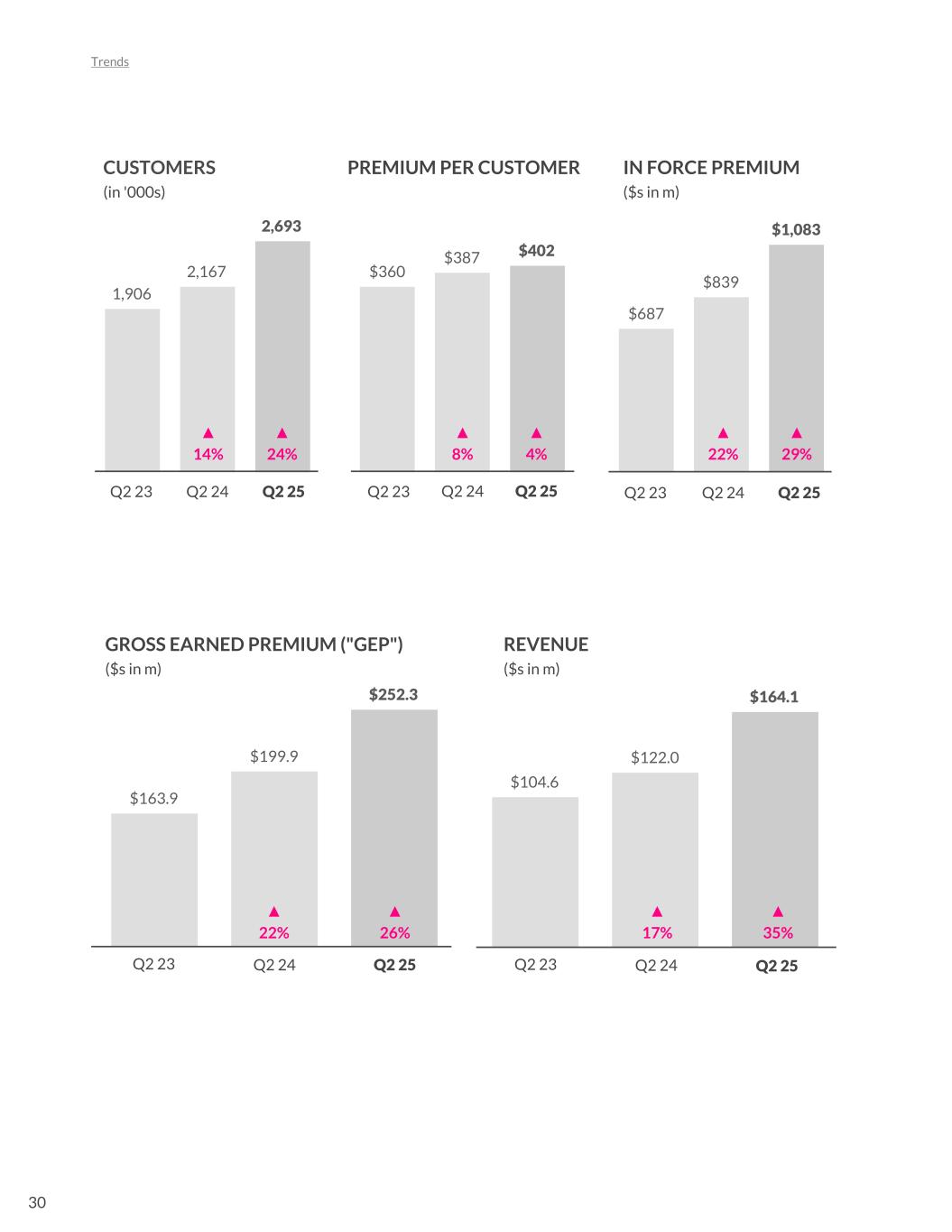 Historical Operating Metrics $ in millions except Premium per customer, unaudited June 30, Sept. 30, Dec. 31, Mar. 31, June 30, Sept. 30, Dec. 31, Mar. 31, June 30, Three months ended, unless specified 2023 2023 2023 2024 2024 2024 2024 2025 2025 Customers (end of period) 1,906,408 1,984,154 2,026,918 2,095,275 2,167,194 2,313,113 2,430,056 2,545,496 2,693,107 In force premium (end of period) $ 686.6 $ 719.0 $ 747.3 $ 794.2 $ 838.8 $ 889.1 $ 943.7 $ 1,007.8 $ 1,083.4 Premium per customer (end of period) $ 360 $ 362 $ 369 $ 379 $ 387 $ 384 $ 388 $ 396 $ 402 Annual dollar retention (end of period) 87% 85% 87% 88% 88% 87% 86% 84% 84% Total revenue $ 104.6 $ 114.5 $ 115.5 $ 119.1 $ 122.0 $ 136.6 $ 148.8 $ 151.2 $ 164.1 Gross earned premium $ 163.9 $ 173.2 $ 181.0 $ 187.9 $ 199.9 $ 213.1 $ 226.4 $ 233.6 $ 252.3 Gross profit $ 12.1 $ 21.9 $ 33.6 $ 34.7 $ 30.8 $ 37.5 $ 63.9 $ 38.6 $ 64.3 Adjusted gross profit $ 16.6 $ 24.9 $ 35.3 $ 36.7 $ 33.4 $ 38.6 $ 66.2 $ 46.0 $ 65.6 Net loss $ (67.2) $ (61.5) $ (42.4) $ (47.3) $ (57.2) $ (67.7) $ (30.0) $ (62.4) $ (43.9) Adjusted EBITDA $ (52.7) $ (40.2) $ (28.9) $ (33.9) $ (43.0) $ (49.0) $ (23.8) $ (47.0) $ (40.9) Gross profit margin 12% 19% 29% 29% 25% 27% 43% 26% 39% Adjusted gross profit margin 16% 22% 31% 31% 27% 28% 44% 30% 40% Ratio of Adjusted gross profit to Gross earned premium 10% 14% 20% 20% 17% 18% 29% 20% 26% Gross loss ratio 94% 83% 77% 79% 79% 73% 63% 78% 67% Net loss ratio 99% 88% 78% 78% 79% 81% 62% 82% 69% 28