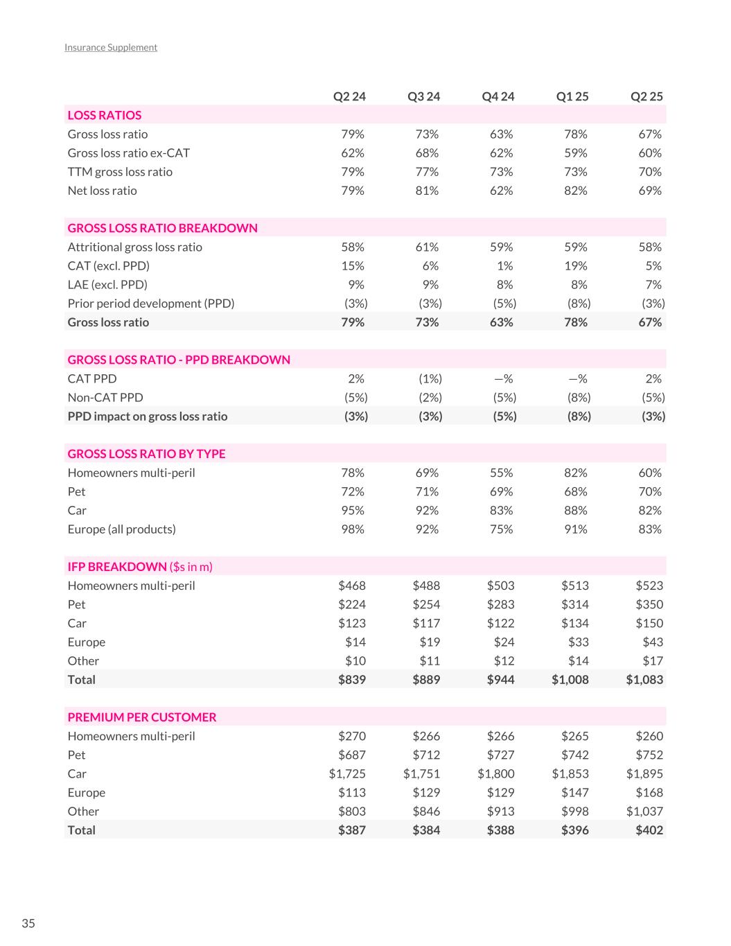 Q2 24 Q3 24 Q4 24 Q1 25 Q2 25 LOSS RATIOS Gross loss ratio 79% 73% 63% 78% 67% Gross loss ratio ex-CAT 62% 68% 62% 59% 60% TTM gross loss ratio 79% 77% 73% 73% 70% Net loss ratio 79% 81% 62% 82% 69% GROSS LOSS RATIO BREAKDOWN Attritional gross loss ratio 58% 61% 59% 59% 58% CAT (excl. PPD) 15% 6% 1% 19% 5% LAE (excl. PPD) 9% 9% 8% 8% 7% Prior period development (PPD) (3%) (3%) (5%) (8%) (3%) Gross loss ratio 79% 73% 63% 78% 67% GROSS LOSS RATIO - PPD BREAKDOWN CAT PPD 2% (1%) —% —% 2% Non-CAT PPD (5%) (2%) (5%) (8%) (5%) PPD impact on gross loss ratio (3%) (3%) (5%) (8%) (3%) GROSS LOSS RATIO BY TYPE Homeowners multi-peril 78% 69% 55% 82% 60% Pet 72% 71% 69% 68% 70% Car 95% 92% 83% 88% 82% Europe (all products) 98% 92% 75% 91% 83% IFP BREAKDOWN ($s in m) Homeowners multi-peril $468 $488 $503 $513 $523 Pet $224 $254 $283 $314 $350 Car $123 $117 $122 $134 $150 Europe $14 $19 $24 $33 $43 Other $10 $11 $12 $14 $17 Total $839 $889 $944 $1,008 $1,083 PREMIUM PER CUSTOMER Homeowners multi-peril $270 $266 $266 $265 $260 Pet $687 $712 $727 $742 $752 Car $1,725 $1,751 $1,800 $1,853 $1,895 Europe $113 $129 $129 $147 $168 Other $803 $846 $913 $998 $1,037 Total $387 $384 $388 $396 $402 Insurance Supplement 35