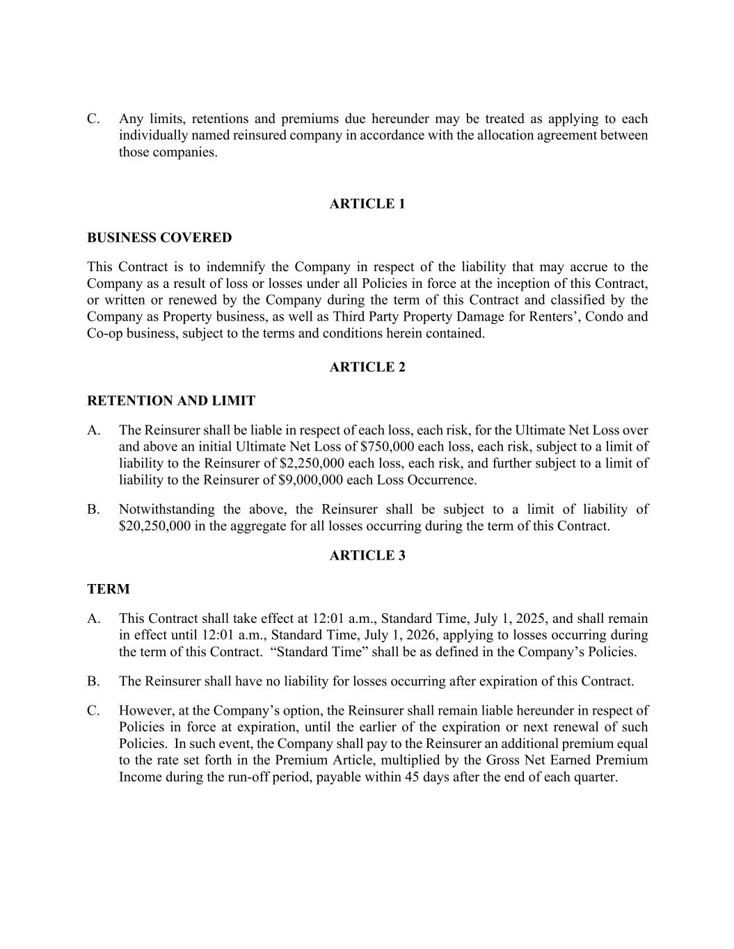 C. Any limits, retentions and premiums due hereunder may be treated as applying to each individually named reinsured company in accordance with the allocation agreement between those companies. ARTICLE 1 BUSINESS COVERED This Contract is to indemnify the Company in respect of the liability that may accrue to the Company as a result of loss or losses under all Policies in force at the inception of this Contract, or written or renewed by the Company during the term of this Contract and classified by the Company as Property business, as well as Third Party Property Damage for Renters’, Condo and Co-op business, subject to the terms and conditions herein contained. ARTICLE 2 RETENTION AND LIMIT A. The Reinsurer shall be liable in respect of each loss, each risk, for the Ultimate Net Loss over and above an initial Ultimate Net Loss of $750,000 each loss, each risk, subject to a limit of liability to the Reinsurer of $2,250,000 each loss, each risk, and further subject to a limit of liability to the Reinsurer of $9,000,000 each Loss Occurrence. B. Notwithstanding the above, the Reinsurer shall be subject to a limit of liability of $20,250,000 in the aggregate for all losses occurring during the term of this Contract. ARTICLE 3 TERM A. This Contract shall take effect at 12:01 a.m., Standard Time, July 1, 2025, and shall remain in effect until 12:01 a.m., Standard Time, July 1, 2026, applying to losses occurring during the term of this Contract. “Standard Time” shall be as defined in the Company’s Policies. B. The Reinsurer shall have no liability for losses occurring after expiration of this Contract. C. However, at the Company’s option, the Reinsurer shall remain liable hereunder in respect of Policies in force at expiration, until the earlier of the expiration or next renewal of such Policies. In such event, the Company shall pay to the Reinsurer an additional premium equal to the rate set forth in the Premium Article, multiplied by the Gross Net Earned Premium Income during the run-off period, payable within 45 days after the end of each quarter.