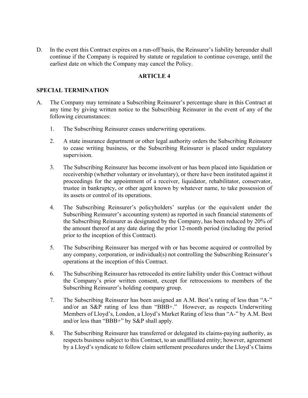 D. In the event this Contract expires on a run-off basis, the Reinsurer’s liability hereunder shall continue if the Company is required by statute or regulation to continue coverage, until the earliest date on which the Company may cancel the Policy. ARTICLE 4 SPECIAL TERMINATION A. The Company may terminate a Subscribing Reinsurer’s percentage share in this Contract at any time by giving written notice to the Subscribing Reinsurer in the event of any of the following circumstances: 1. The Subscribing Reinsurer ceases underwriting operations. 2. A state insurance department or other legal authority orders the Subscribing Reinsurer to cease writing business, or the Subscribing Reinsurer is placed under regulatory supervision. 3. The Subscribing Reinsurer has become insolvent or has been placed into liquidation or receivership (whether voluntary or involuntary), or there have been instituted against it proceedings for the appointment of a receiver, liquidator, rehabilitator, conservator, trustee in bankruptcy, or other agent known by whatever name, to take possession of its assets or control of its operations. 4. The Subscribing Reinsurer’s policyholders’ surplus (or the equivalent under the Subscribing Reinsurer’s accounting system) as reported in such financial statements of the Subscribing Reinsurer as designated by the Company, has been reduced by 20% of the amount thereof at any date during the prior 12-month period (including the period prior to the inception of this Contract). 5. The Subscribing Reinsurer has merged with or has become acquired or controlled by any company, corporation, or individual(s) not controlling the Subscribing Reinsurer’s operations at the inception of this Contract. 6. The Subscribing Reinsurer has retroceded its entire liability under this Contract without the Company’s prior written consent, except for retrocessions to members of the Subscribing Reinsurer’s holding company group. 7. The Subscribing Reinsurer has been assigned an A.M. Best’s rating of less than “A-” and/or an S&P rating of less than “BBB+.” However, as respects Underwriting Members of Lloyd’s, London, a Lloyd’s Market Rating of less than “A-” by A.M. Best and/or less than “BBB+” by S&P shall apply. 8. The Subscribing Reinsurer has transferred or delegated its claims-paying authority, as respects business subject to this Contract, to an unaffiliated entity; however, agreement by a Lloyd’s syndicate to follow claim settlement procedures under the Lloyd’s Claims