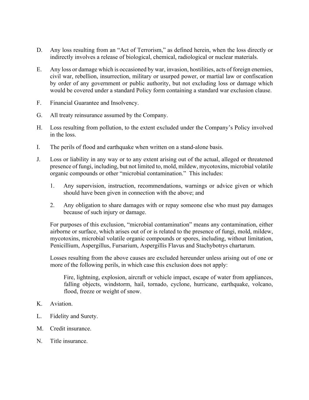 D. Any loss resulting from an “Act of Terrorism,” as defined herein, when the loss directly or indirectly involves a release of biological, chemical, radiological or nuclear materials. E. Any loss or damage which is occasioned by war, invasion, hostilities, acts of foreign enemies, civil war, rebellion, insurrection, military or usurped power, or martial law or confiscation by order of any government or public authority, but not excluding loss or damage which would be covered under a standard Policy form containing a standard war exclusion clause. F. Financial Guarantee and Insolvency. G. All treaty reinsurance assumed by the Company. H. Loss resulting from pollution, to the extent excluded under the Company’s Policy involved in the loss. I. The perils of flood and earthquake when written on a stand-alone basis. J. Loss or liability in any way or to any extent arising out of the actual, alleged or threatened presence of fungi, including, but not limited to, mold, mildew, mycotoxins, microbial volatile organic compounds or other “microbial contamination.” This includes: 1. Any supervision, instruction, recommendations, warnings or advice given or which should have been given in connection with the above; and 2. Any obligation to share damages with or repay someone else who must pay damages because of such injury or damage. For purposes of this exclusion, “microbial contamination” means any contamination, either airborne or surface, which arises out of or is related to the presence of fungi, mold, mildew, mycotoxins, microbial volatile organic compounds or spores, including, without limitation, Penicillium, Aspergillus, Fursarium, Aspergillis Flavus and Stachybotrys chartarum. Losses resulting from the above causes are excluded hereunder unless arising out of one or more of the following perils, in which case this exclusion does not apply: Fire, lightning, explosion, aircraft or vehicle impact, escape of water from appliances, falling objects, windstorm, hail, tornado, cyclone, hurricane, earthquake, volcano, flood, freeze or weight of snow. K. Aviation. L. Fidelity and Surety. M. Credit insurance. N. Title insurance.