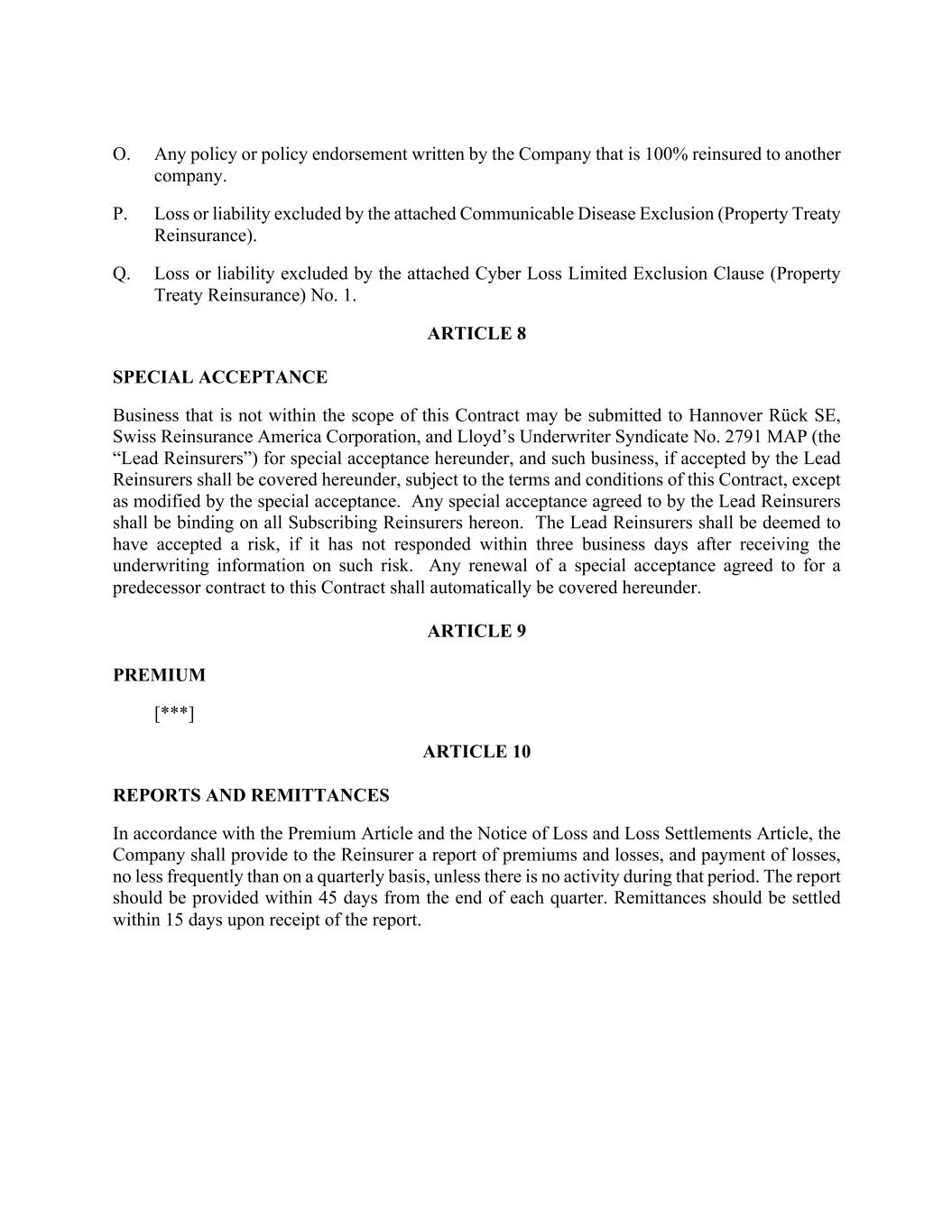 O. Any policy or policy endorsement written by the Company that is 100% reinsured to another company. P. Loss or liability excluded by the attached Communicable Disease Exclusion (Property Treaty Reinsurance). Q. Loss or liability excluded by the attached Cyber Loss Limited Exclusion Clause (Property Treaty Reinsurance) No. 1. ARTICLE 8 SPECIAL ACCEPTANCE Business that is not within the scope of this Contract may be submitted to Hannover Rück SE, Swiss Reinsurance America Corporation, and Lloyd’s Underwriter Syndicate No. 2791 MAP (the “Lead Reinsurers”) for special acceptance hereunder, and such business, if accepted by the Lead Reinsurers shall be covered hereunder, subject to the terms and conditions of this Contract, except as modified by the special acceptance. Any special acceptance agreed to by the Lead Reinsurers shall be binding on all Subscribing Reinsurers hereon. The Lead Reinsurers shall be deemed to have accepted a risk, if it has not responded within three business days after receiving the underwriting information on such risk. Any renewal of a special acceptance agreed to for a predecessor contract to this Contract shall automatically be covered hereunder. ARTICLE 9 PREMIUM [***] ARTICLE 10 REPORTS AND REMITTANCES In accordance with the Premium Article and the Notice of Loss and Loss Settlements Article, the Company shall provide to the Reinsurer a report of premiums and losses, and payment of losses, no less frequently than on a quarterly basis, unless there is no activity during that period. The report should be provided within 45 days from the end of each quarter. Remittances should be settled within 15 days upon receipt of the report.