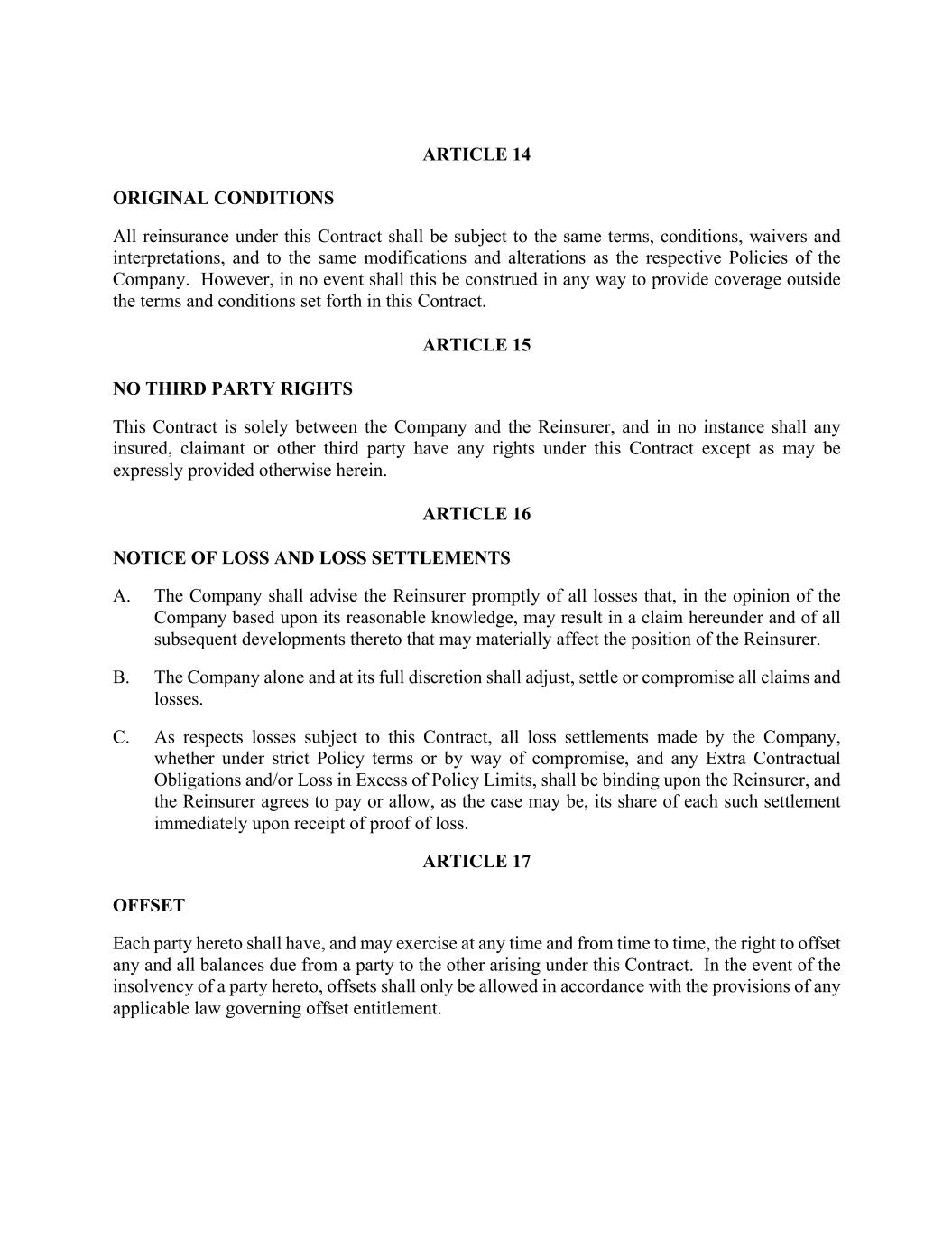 ARTICLE 14 ORIGINAL CONDITIONS All reinsurance under this Contract shall be subject to the same terms, conditions, waivers and interpretations, and to the same modifications and alterations as the respective Policies of the Company. However, in no event shall this be construed in any way to provide coverage outside the terms and conditions set forth in this Contract. ARTICLE 15 NO THIRD PARTY RIGHTS This Contract is solely between the Company and the Reinsurer, and in no instance shall any insured, claimant or other third party have any rights under this Contract except as may be expressly provided otherwise herein. ARTICLE 16 NOTICE OF LOSS AND LOSS SETTLEMENTS A. The Company shall advise the Reinsurer promptly of all losses that, in the opinion of the Company based upon its reasonable knowledge, may result in a claim hereunder and of all subsequent developments thereto that may materially affect the position of the Reinsurer. B. The Company alone and at its full discretion shall adjust, settle or compromise all claims and losses. C. As respects losses subject to this Contract, all loss settlements made by the Company, whether under strict Policy terms or by way of compromise, and any Extra Contractual Obligations and/or Loss in Excess of Policy Limits, shall be binding upon the Reinsurer, and the Reinsurer agrees to pay or allow, as the case may be, its share of each such settlement immediately upon receipt of proof of loss. ARTICLE 17 OFFSET Each party hereto shall have, and may exercise at any time and from time to time, the right to offset any and all balances due from a party to the other arising under this Contract. In the event of the insolvency of a party hereto, offsets shall only be allowed in accordance with the provisions of any applicable law governing offset entitlement.
