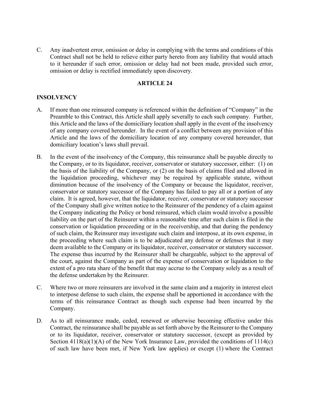 C. Any inadvertent error, omission or delay in complying with the terms and conditions of this Contract shall not be held to relieve either party hereto from any liability that would attach to it hereunder if such error, omission or delay had not been made, provided such error, omission or delay is rectified immediately upon discovery. ARTICLE 24 INSOLVENCY A. If more than one reinsured company is referenced within the definition of “Company” in the Preamble to this Contract, this Article shall apply severally to each such company. Further, this Article and the laws of the domiciliary location shall apply in the event of the insolvency of any company covered hereunder. In the event of a conflict between any provision of this Article and the laws of the domiciliary location of any company covered hereunder, that domiciliary location’s laws shall prevail. B. In the event of the insolvency of the Company, this reinsurance shall be payable directly to the Company, or to its liquidator, receiver, conservator or statutory successor, either: (1) on the basis of the liability of the Company, or (2) on the basis of claims filed and allowed in the liquidation proceeding, whichever may be required by applicable statute, without diminution because of the insolvency of the Company or because the liquidator, receiver, conservator or statutory successor of the Company has failed to pay all or a portion of any claim. It is agreed, however, that the liquidator, receiver, conservator or statutory successor of the Company shall give written notice to the Reinsurer of the pendency of a claim against the Company indicating the Policy or bond reinsured, which claim would involve a possible liability on the part of the Reinsurer within a reasonable time after such claim is filed in the conservation or liquidation proceeding or in the receivership, and that during the pendency of such claim, the Reinsurer may investigate such claim and interpose, at its own expense, in the proceeding where such claim is to be adjudicated any defense or defenses that it may deem available to the Company or its liquidator, receiver, conservator or statutory successor. The expense thus incurred by the Reinsurer shall be chargeable, subject to the approval of the court, against the Company as part of the expense of conservation or liquidation to the extent of a pro rata share of the benefit that may accrue to the Company solely as a result of the defense undertaken by the Reinsurer. C. Where two or more reinsurers are involved in the same claim and a majority in interest elect to interpose defense to such claim, the expense shall be apportioned in accordance with the terms of this reinsurance Contract as though such expense had been incurred by the Company. D. As to all reinsurance made, ceded, renewed or otherwise becoming effective under this Contract, the reinsurance shall be payable as set forth above by the Reinsurer to the Company or to its liquidator, receiver, conservator or statutory successor, (except as provided by Section 4118(a)(1)(A) of the New York Insurance Law, provided the conditions of 1114(c) of such law have been met, if New York law applies) or except (1) where the Contract