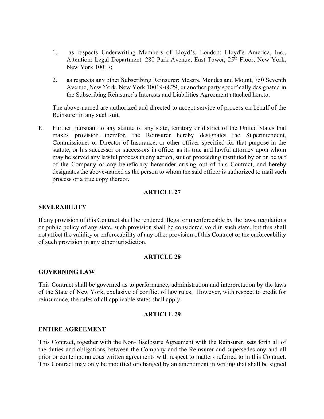 1. as respects Underwriting Members of Lloyd’s, London: Lloyd’s America, Inc., Attention: Legal Department, 280 Park Avenue, East Tower, 25th Floor, New York, New York 10017; 2. as respects any other Subscribing Reinsurer: Messrs. Mendes and Mount, 750 Seventh Avenue, New York, New York 10019-6829, or another party specifically designated in the Subscribing Reinsurer’s Interests and Liabilities Agreement attached hereto. The above-named are authorized and directed to accept service of process on behalf of the Reinsurer in any such suit. E. Further, pursuant to any statute of any state, territory or district of the United States that makes provision therefor, the Reinsurer hereby designates the Superintendent, Commissioner or Director of Insurance, or other officer specified for that purpose in the statute, or his successor or successors in office, as its true and lawful attorney upon whom may be served any lawful process in any action, suit or proceeding instituted by or on behalf of the Company or any beneficiary hereunder arising out of this Contract, and hereby designates the above-named as the person to whom the said officer is authorized to mail such process or a true copy thereof. ARTICLE 27 SEVERABILITY If any provision of this Contract shall be rendered illegal or unenforceable by the laws, regulations or public policy of any state, such provision shall be considered void in such state, but this shall not affect the validity or enforceability of any other provision of this Contract or the enforceability of such provision in any other jurisdiction. ARTICLE 28 GOVERNING LAW This Contract shall be governed as to performance, administration and interpretation by the laws of the State of New York, exclusive of conflict of law rules. However, with respect to credit for reinsurance, the rules of all applicable states shall apply. ARTICLE 29 ENTIRE AGREEMENT This Contract, together with the Non-Disclosure Agreement with the Reinsurer, sets forth all of the duties and obligations between the Company and the Reinsurer and supersedes any and all prior or contemporaneous written agreements with respect to matters referred to in this Contract. This Contract may only be modified or changed by an amendment in writing that shall be signed