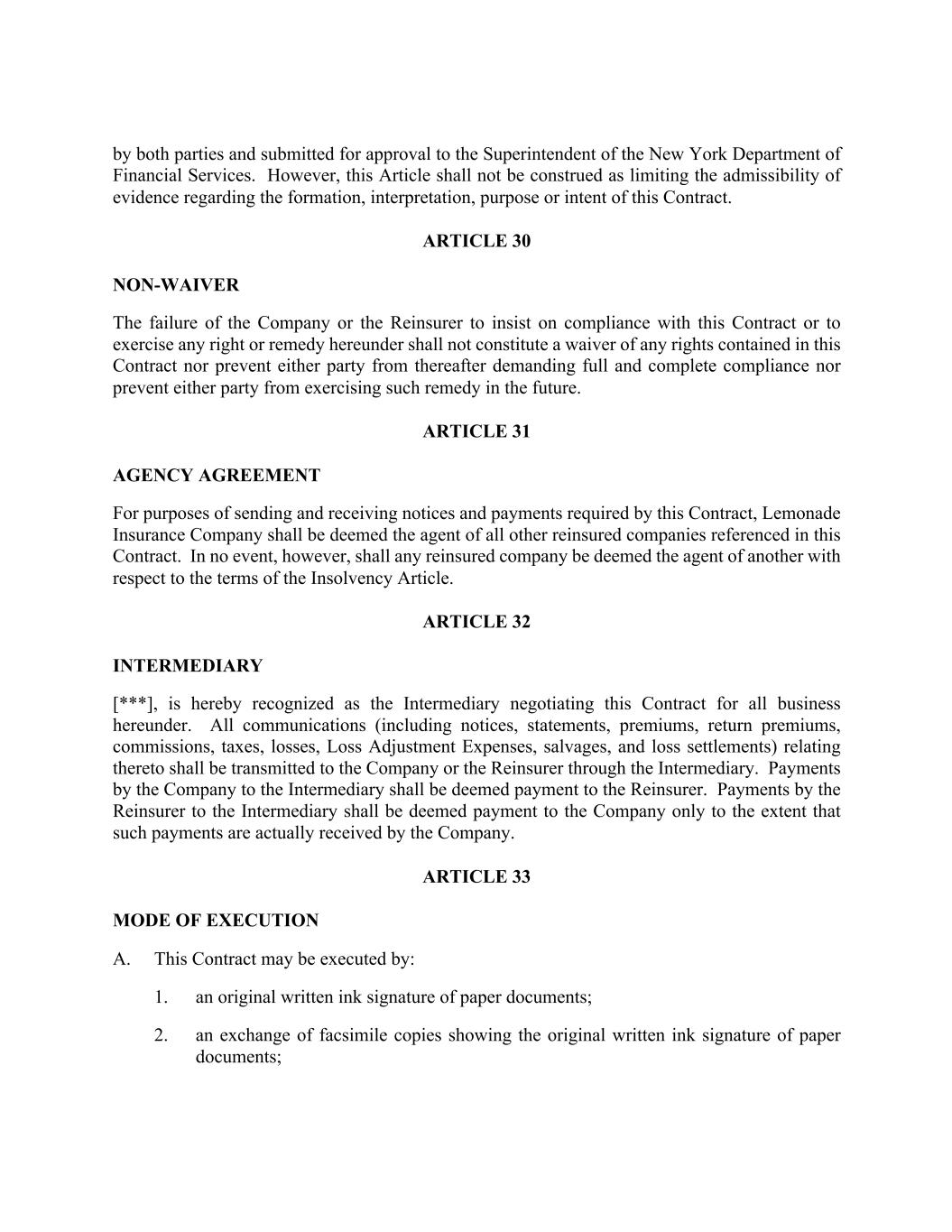 by both parties and submitted for approval to the Superintendent of the New York Department of Financial Services. However, this Article shall not be construed as limiting the admissibility of evidence regarding the formation, interpretation, purpose or intent of this Contract. ARTICLE 30 NON-WAIVER The failure of the Company or the Reinsurer to insist on compliance with this Contract or to exercise any right or remedy hereunder shall not constitute a waiver of any rights contained in this Contract nor prevent either party from thereafter demanding full and complete compliance nor prevent either party from exercising such remedy in the future. ARTICLE 31 AGENCY AGREEMENT For purposes of sending and receiving notices and payments required by this Contract, Lemonade Insurance Company shall be deemed the agent of all other reinsured companies referenced in this Contract. In no event, however, shall any reinsured company be deemed the agent of another with respect to the terms of the Insolvency Article. ARTICLE 32 INTERMEDIARY [***], is hereby recognized as the Intermediary negotiating this Contract for all business hereunder. All communications (including notices, statements, premiums, return premiums, commissions, taxes, losses, Loss Adjustment Expenses, salvages, and loss settlements) relating thereto shall be transmitted to the Company or the Reinsurer through the Intermediary. Payments by the Company to the Intermediary shall be deemed payment to the Reinsurer. Payments by the Reinsurer to the Intermediary shall be deemed payment to the Company only to the extent that such payments are actually received by the Company. ARTICLE 33 MODE OF EXECUTION A. This Contract may be executed by: 1. an original written ink signature of paper documents; 2. an exchange of facsimile copies showing the original written ink signature of paper documents;
