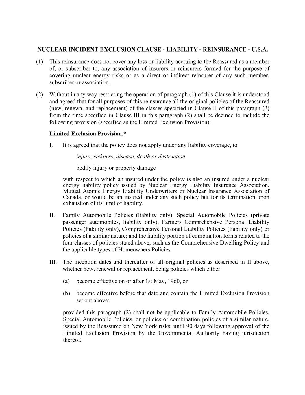 NUCLEAR INCIDENT EXCLUSION CLAUSE - LIABILITY - REINSURANCE - U.S.A. (1) This reinsurance does not cover any loss or liability accruing to the Reassured as a member of, or subscriber to, any association of insurers or reinsurers formed for the purpose of covering nuclear energy risks or as a direct or indirect reinsurer of any such member, subscriber or association. (2) Without in any way restricting the operation of paragraph (1) of this Clause it is understood and agreed that for all purposes of this reinsurance all the original policies of the Reassured (new, renewal and replacement) of the classes specified in Clause II of this paragraph (2) from the time specified in Clause III in this paragraph (2) shall be deemed to include the following provision (specified as the Limited Exclusion Provision): Limited Exclusion Provision.* I. It is agreed that the policy does not apply under any liability coverage, to injury, sickness, disease, death or destruction bodily injury or property damage with respect to which an insured under the policy is also an insured under a nuclear energy liability policy issued by Nuclear Energy Liability Insurance Association, Mutual Atomic Energy Liability Underwriters or Nuclear Insurance Association of Canada, or would be an insured under any such policy but for its termination upon exhaustion of its limit of liability. II. Family Automobile Policies (liability only), Special Automobile Policies (private passenger automobiles, liability only), Farmers Comprehensive Personal Liability Policies (liability only), Comprehensive Personal Liability Policies (liability only) or policies of a similar nature; and the liability portion of combination forms related to the four classes of policies stated above, such as the Comprehensive Dwelling Policy and the applicable types of Homeowners Policies. III. The inception dates and thereafter of all original policies as described in II above, whether new, renewal or replacement, being policies which either (a) become effective on or after 1st May, 1960, or (b) become effective before that date and contain the Limited Exclusion Provision set out above; provided this paragraph (2) shall not be applicable to Family Automobile Policies, Special Automobile Policies, or policies or combination policies of a similar nature, issued by the Reassured on New York risks, until 90 days following approval of the Limited Exclusion Provision by the Governmental Authority having jurisdiction thereof.