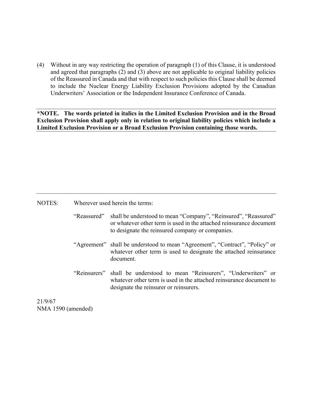 (4) Without in any way restricting the operation of paragraph (1) of this Clause, it is understood and agreed that paragraphs (2) and (3) above are not applicable to original liability policies of the Reassured in Canada and that with respect to such policies this Clause shall be deemed to include the Nuclear Energy Liability Exclusion Provisions adopted by the Canadian Underwriters’ Association or the Independent Insurance Conference of Canada. *NOTE. The words printed in italics in the Limited Exclusion Provision and in the Broad Exclusion Provision shall apply only in relation to original liability policies which include a Limited Exclusion Provision or a Broad Exclusion Provision containing those words. NOTES: Wherever used herein the terms: “Reassured” shall be understood to mean “Company”, “Reinsured”, “Reassured” or whatever other term is used in the attached reinsurance document to designate the reinsured company or companies. “Agreement” shall be understood to mean “Agreement”, “Contract”, “Policy” or whatever other term is used to designate the attached reinsurance document. “Reinsurers” shall be understood to mean “Reinsurers”, “Underwriters” or whatever other term is used in the attached reinsurance document to designate the reinsurer or reinsurers. 21/9/67 NMA 1590 (amended)