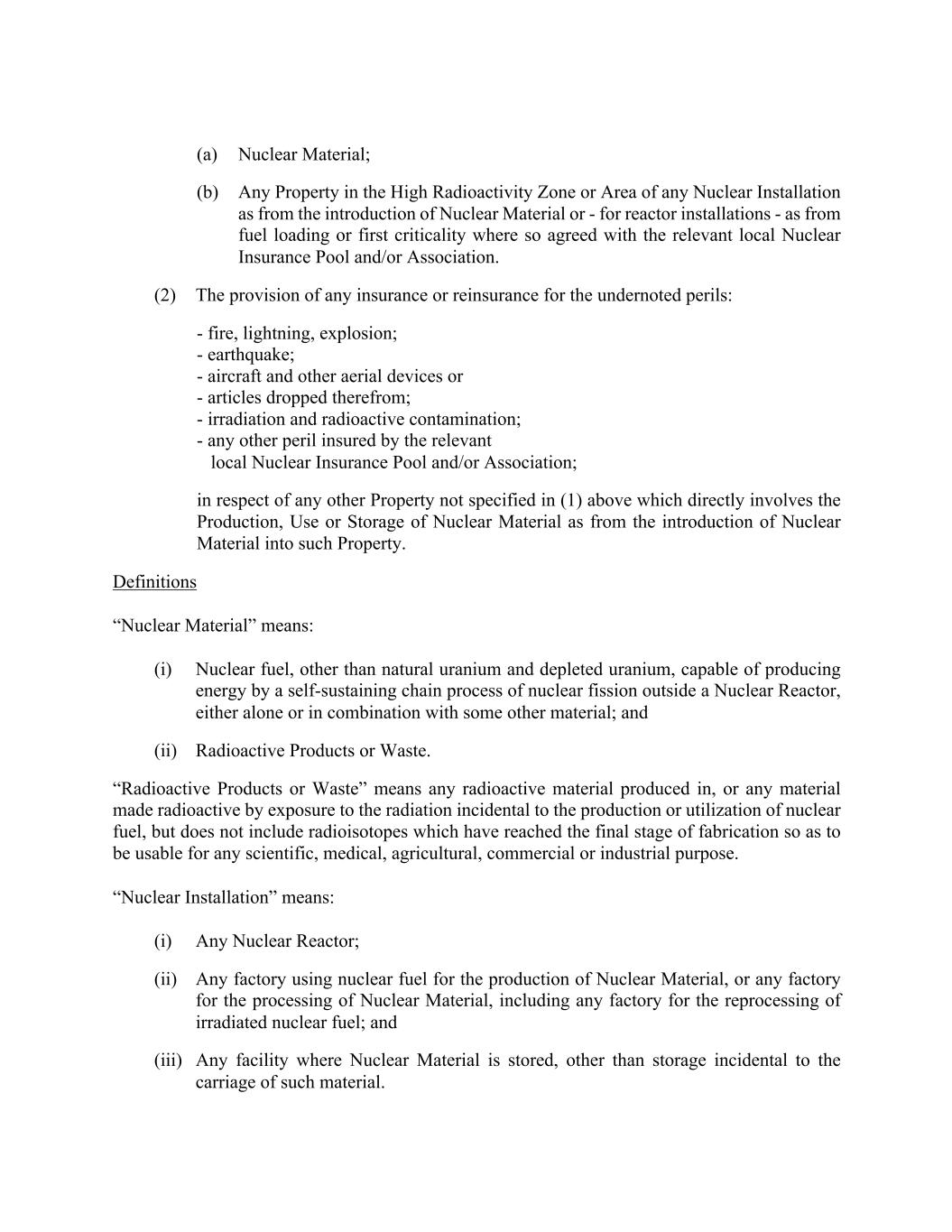 (a) Nuclear Material; (b) Any Property in the High Radioactivity Zone or Area of any Nuclear Installation as from the introduction of Nuclear Material or - for reactor installations - as from fuel loading or first criticality where so agreed with the relevant local Nuclear Insurance Pool and/or Association. (2) The provision of any insurance or reinsurance for the undernoted perils: - fire, lightning, explosion; - earthquake; - aircraft and other aerial devices or - articles dropped therefrom; - irradiation and radioactive contamination; - any other peril insured by the relevant local Nuclear Insurance Pool and/or Association; in respect of any other Property not specified in (1) above which directly involves the Production, Use or Storage of Nuclear Material as from the introduction of Nuclear Material into such Property. Definitions “Nuclear Material” means: (i) Nuclear fuel, other than natural uranium and depleted uranium, capable of producing energy by a self-sustaining chain process of nuclear fission outside a Nuclear Reactor, either alone or in combination with some other material; and (ii) Radioactive Products or Waste. “Radioactive Products or Waste” means any radioactive material produced in, or any material made radioactive by exposure to the radiation incidental to the production or utilization of nuclear fuel, but does not include radioisotopes which have reached the final stage of fabrication so as to be usable for any scientific, medical, agricultural, commercial or industrial purpose. “Nuclear Installation” means: (i) Any Nuclear Reactor; (ii) Any factory using nuclear fuel for the production of Nuclear Material, or any factory for the processing of Nuclear Material, including any factory for the reprocessing of irradiated nuclear fuel; and (iii) Any facility where Nuclear Material is stored, other than storage incidental to the carriage of such material.