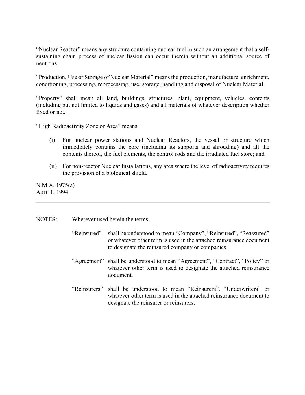 “Nuclear Reactor” means any structure containing nuclear fuel in such an arrangement that a self- sustaining chain process of nuclear fission can occur therein without an additional source of neutrons. “Production, Use or Storage of Nuclear Material” means the production, manufacture, enrichment, conditioning, processing, reprocessing, use, storage, handling and disposal of Nuclear Material. “Property” shall mean all land, buildings, structures, plant, equipment, vehicles, contents (including but not limited to liquids and gases) and all materials of whatever description whether fixed or not. “High Radioactivity Zone or Area” means: (i) For nuclear power stations and Nuclear Reactors, the vessel or structure which immediately contains the core (including its supports and shrouding) and all the contents thereof, the fuel elements, the control rods and the irradiated fuel store; and (ii) For non-reactor Nuclear Installations, any area where the level of radioactivity requires the provision of a biological shield. N.M.A. 1975(a) April 1, 1994 NOTES: Wherever used herein the terms: “Reinsured” shall be understood to mean “Company”, “Reinsured”, “Reassured” or whatever other term is used in the attached reinsurance document to designate the reinsured company or companies. “Agreement” shall be understood to mean “Agreement”, “Contract”, “Policy” or whatever other term is used to designate the attached reinsurance document. “Reinsurers” shall be understood to mean “Reinsurers”, “Underwriters” or whatever other term is used in the attached reinsurance document to designate the reinsurer or reinsurers.
