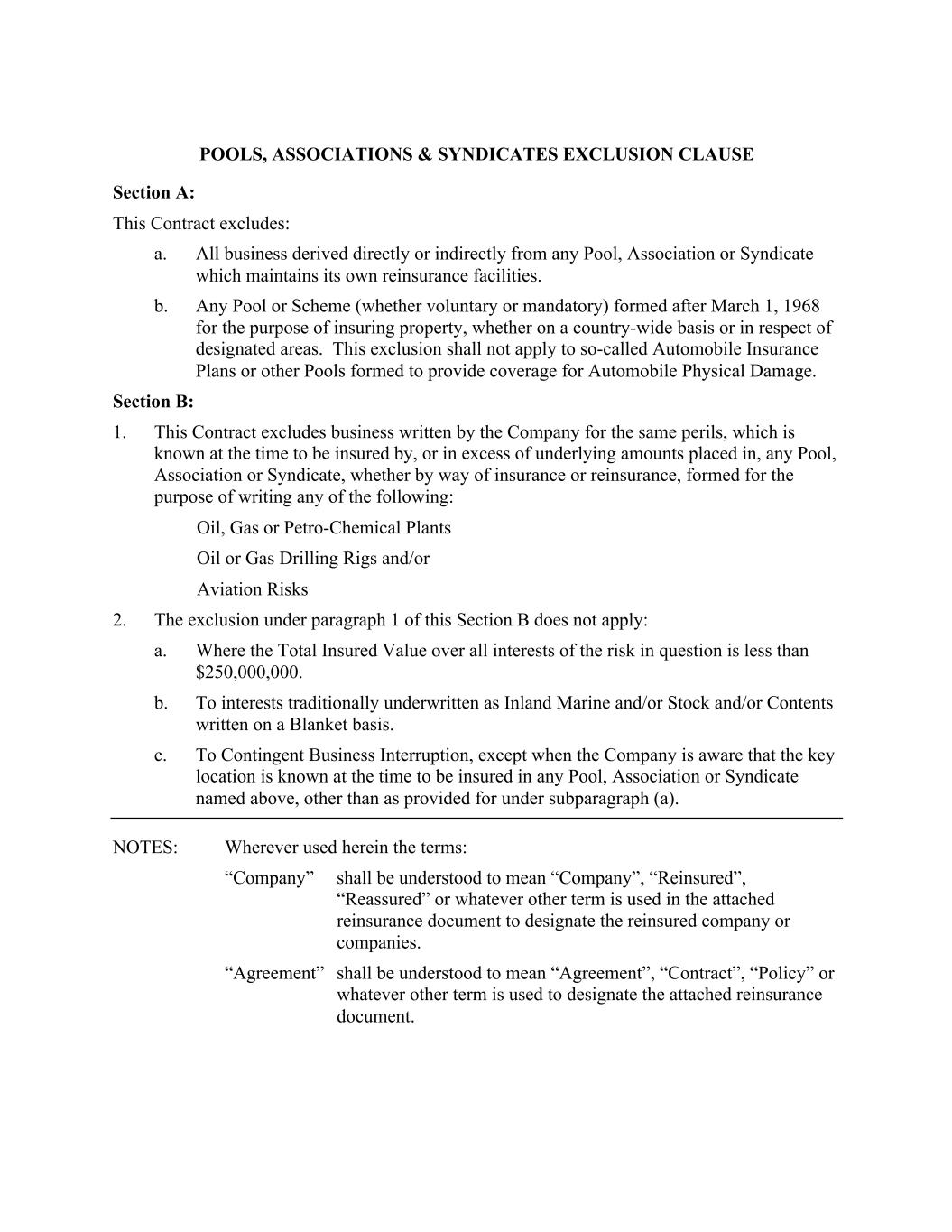 POOLS, ASSOCIATIONS & SYNDICATES EXCLUSION CLAUSE Section A: This Contract excludes: a. All business derived directly or indirectly from any Pool, Association or Syndicate which maintains its own reinsurance facilities. b. Any Pool or Scheme (whether voluntary or mandatory) formed after March 1, 1968 for the purpose of insuring property, whether on a country-wide basis or in respect of designated areas. This exclusion shall not apply to so-called Automobile Insurance Plans or other Pools formed to provide coverage for Automobile Physical Damage. Section B: 1. This Contract excludes business written by the Company for the same perils, which is known at the time to be insured by, or in excess of underlying amounts placed in, any Pool, Association or Syndicate, whether by way of insurance or reinsurance, formed for the purpose of writing any of the following: Oil, Gas or Petro-Chemical Plants Oil or Gas Drilling Rigs and/or Aviation Risks 2. The exclusion under paragraph 1 of this Section B does not apply: a. Where the Total Insured Value over all interests of the risk in question is less than $250,000,000. b. To interests traditionally underwritten as Inland Marine and/or Stock and/or Contents written on a Blanket basis. c. To Contingent Business Interruption, except when the Company is aware that the key location is known at the time to be insured in any Pool, Association or Syndicate named above, other than as provided for under subparagraph (a). NOTES: Wherever used herein the terms: “Company” shall be understood to mean “Company”, “Reinsured”, “Reassured” or whatever other term is used in the attached reinsurance document to designate the reinsured company or companies. “Agreement” shall be understood to mean “Agreement”, “Contract”, “Policy” or whatever other term is used to designate the attached reinsurance document.