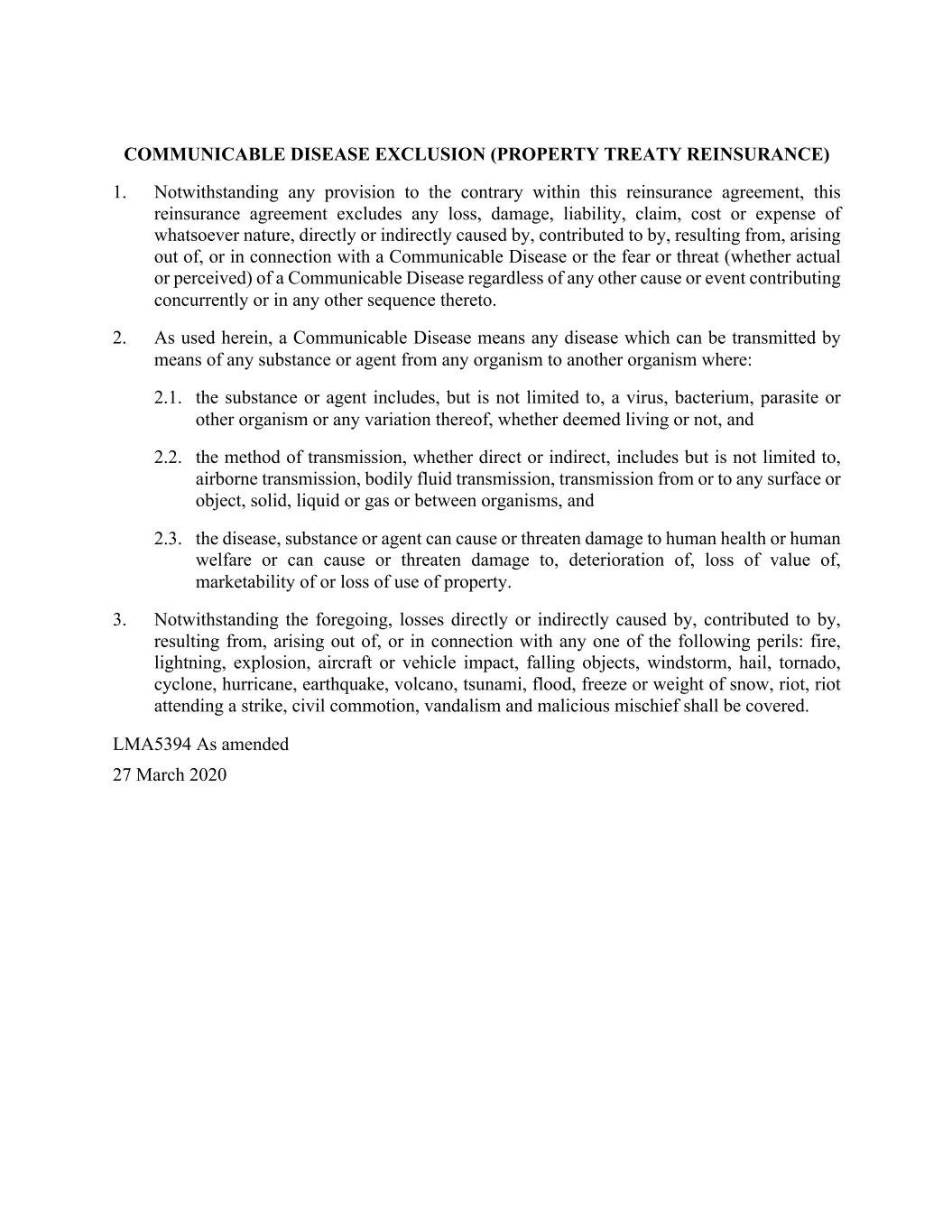 COMMUNICABLE DISEASE EXCLUSION (PROPERTY TREATY REINSURANCE) 1. Notwithstanding any provision to the contrary within this reinsurance agreement, this reinsurance agreement excludes any loss, damage, liability, claim, cost or expense of whatsoever nature, directly or indirectly caused by, contributed to by, resulting from, arising out of, or in connection with a Communicable Disease or the fear or threat (whether actual or perceived) of a Communicable Disease regardless of any other cause or event contributing concurrently or in any other sequence thereto. 2. As used herein, a Communicable Disease means any disease which can be transmitted by means of any substance or agent from any organism to another organism where: 2.1. the substance or agent includes, but is not limited to, a virus, bacterium, parasite or other organism or any variation thereof, whether deemed living or not, and 2.2. the method of transmission, whether direct or indirect, includes but is not limited to, airborne transmission, bodily fluid transmission, transmission from or to any surface or object, solid, liquid or gas or between organisms, and 2.3. the disease, substance or agent can cause or threaten damage to human health or human welfare or can cause or threaten damage to, deterioration of, loss of value of, marketability of or loss of use of property. 3. Notwithstanding the foregoing, losses directly or indirectly caused by, contributed to by, resulting from, arising out of, or in connection with any one of the following perils: fire, lightning, explosion, aircraft or vehicle impact, falling objects, windstorm, hail, tornado, cyclone, hurricane, earthquake, volcano, tsunami, flood, freeze or weight of snow, riot, riot attending a strike, civil commotion, vandalism and malicious mischief shall be covered. LMA5394 As amended 27 March 2020