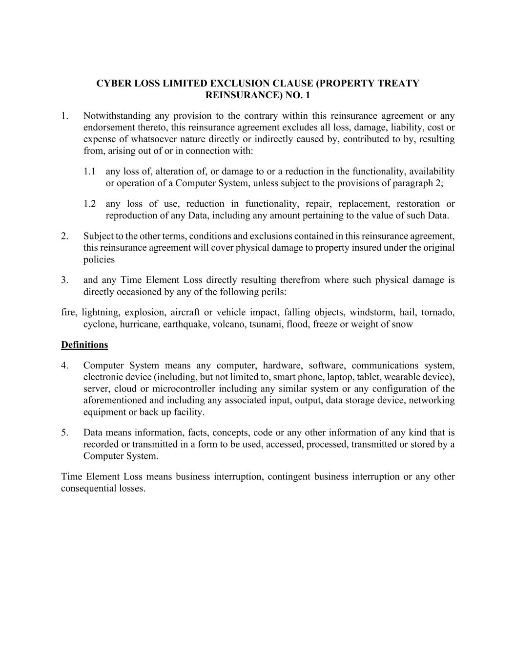 CYBER LOSS LIMITED EXCLUSION CLAUSE (PROPERTY TREATY REINSURANCE) NO. 1 1. Notwithstanding any provision to the contrary within this reinsurance agreement or any endorsement thereto, this reinsurance agreement excludes all loss, damage, liability, cost or expense of whatsoever nature directly or indirectly caused by, contributed to by, resulting from, arising out of or in connection with: 1.1 any loss of, alteration of, or damage to or a reduction in the functionality, availability or operation of a Computer System, unless subject to the provisions of paragraph 2; 1.2 any loss of use, reduction in functionality, repair, replacement, restoration or reproduction of any Data, including any amount pertaining to the value of such Data. 2. Subject to the other terms, conditions and exclusions contained in this reinsurance agreement, this reinsurance agreement will cover physical damage to property insured under the original policies 3. and any Time Element Loss directly resulting therefrom where such physical damage is directly occasioned by any of the following perils: fire, lightning, explosion, aircraft or vehicle impact, falling objects, windstorm, hail, tornado, cyclone, hurricane, earthquake, volcano, tsunami, flood, freeze or weight of snow Definitions 4. Computer System means any computer, hardware, software, communications system, electronic device (including, but not limited to, smart phone, laptop, tablet, wearable device), server, cloud or microcontroller including any similar system or any configuration of the aforementioned and including any associated input, output, data storage device, networking equipment or back up facility. 5. Data means information, facts, concepts, code or any other information of any kind that is recorded or transmitted in a form to be used, accessed, processed, transmitted or stored by a Computer System. Time Element Loss means business interruption, contingent business interruption or any other consequential losses.