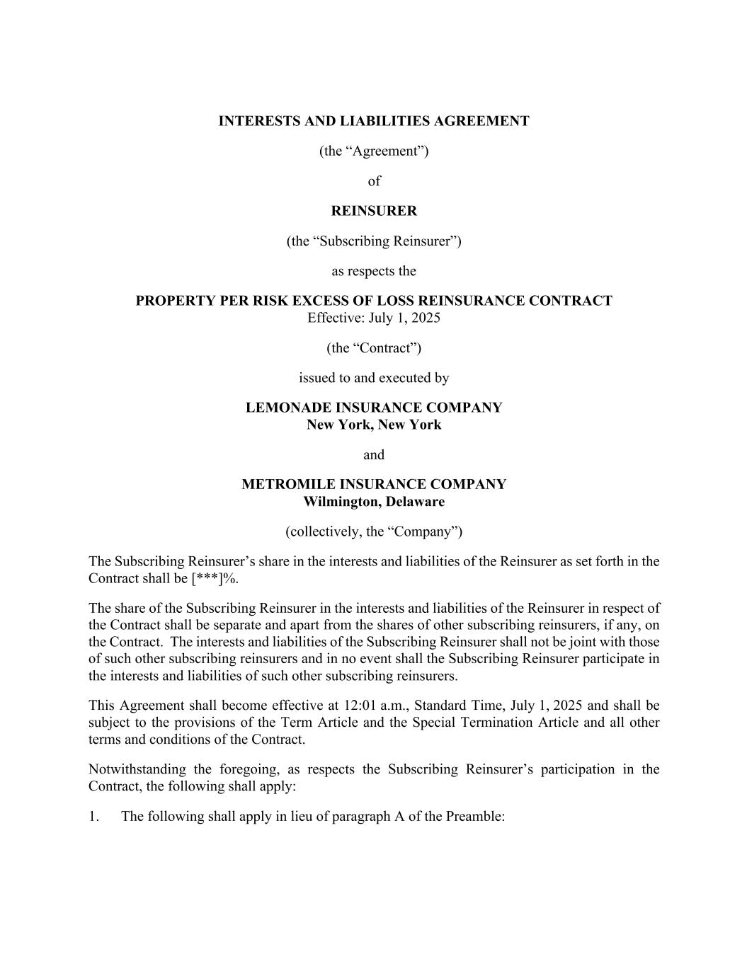 INTERESTS AND LIABILITIES AGREEMENT (the “Agreement”) of REINSURER (the “Subscribing Reinsurer”) as respects the PROPERTY PER RISK EXCESS OF LOSS REINSURANCE CONTRACT Effective: July 1, 2025 (the “Contract”) issued to and executed by LEMONADE INSURANCE COMPANY New York, New York and METROMILE INSURANCE COMPANY Wilmington, Delaware (collectively, the “Company”) The Subscribing Reinsurer’s share in the interests and liabilities of the Reinsurer as set forth in the Contract shall be [***]%. The share of the Subscribing Reinsurer in the interests and liabilities of the Reinsurer in respect of the Contract shall be separate and apart from the shares of other subscribing reinsurers, if any, on the Contract. The interests and liabilities of the Subscribing Reinsurer shall not be joint with those of such other subscribing reinsurers and in no event shall the Subscribing Reinsurer participate in the interests and liabilities of such other subscribing reinsurers. This Agreement shall become effective at 12:01 a.m., Standard Time, July 1, 2025 and shall be subject to the provisions of the Term Article and the Special Termination Article and all other terms and conditions of the Contract. Notwithstanding the foregoing, as respects the Subscribing Reinsurer’s participation in the Contract, the following shall apply: 1. The following shall apply in lieu of paragraph A of the Preamble: