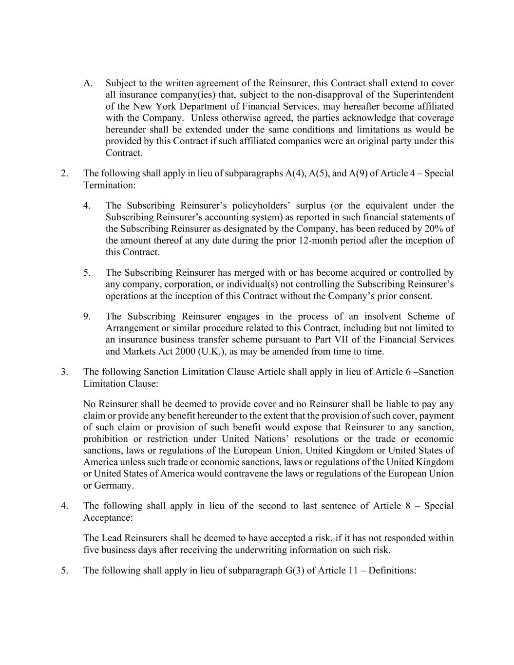 A. Subject to the written agreement of the Reinsurer, this Contract shall extend to cover all insurance company(ies) that, subject to the non-disapproval of the Superintendent of the New York Department of Financial Services, may hereafter become affiliated with the Company. Unless otherwise agreed, the parties acknowledge that coverage hereunder shall be extended under the same conditions and limitations as would be provided by this Contract if such affiliated companies were an original party under this Contract. 2. The following shall apply in lieu of subparagraphs A(4), A(5), and A(9) of Article 4 – Special Termination: 4. The Subscribing Reinsurer’s policyholders’ surplus (or the equivalent under the Subscribing Reinsurer’s accounting system) as reported in such financial statements of the Subscribing Reinsurer as designated by the Company, has been reduced by 20% of the amount thereof at any date during the prior 12-month period after the inception of this Contract. 5. The Subscribing Reinsurer has merged with or has become acquired or controlled by any company, corporation, or individual(s) not controlling the Subscribing Reinsurer’s operations at the inception of this Contract without the Company’s prior consent. 9. The Subscribing Reinsurer engages in the process of an insolvent Scheme of Arrangement or similar procedure related to this Contract, including but not limited to an insurance business transfer scheme pursuant to Part VII of the Financial Services and Markets Act 2000 (U.K.), as may be amended from time to time. 3. The following Sanction Limitation Clause Article shall apply in lieu of Article 6 –Sanction Limitation Clause: No Reinsurer shall be deemed to provide cover and no Reinsurer shall be liable to pay any claim or provide any benefit hereunder to the extent that the provision of such cover, payment of such claim or provision of such benefit would expose that Reinsurer to any sanction, prohibition or restriction under United Nations’ resolutions or the trade or economic sanctions, laws or regulations of the European Union, United Kingdom or United States of America unless such trade or economic sanctions, laws or regulations of the United Kingdom or United States of America would contravene the laws or regulations of the European Union or Germany. 4. The following shall apply in lieu of the second to last sentence of Article 8 – Special Acceptance: The Lead Reinsurers shall be deemed to have accepted a risk, if it has not responded within five business days after receiving the underwriting information on such risk. 5. The following shall apply in lieu of subparagraph G(3) of Article 11 – Definitions: