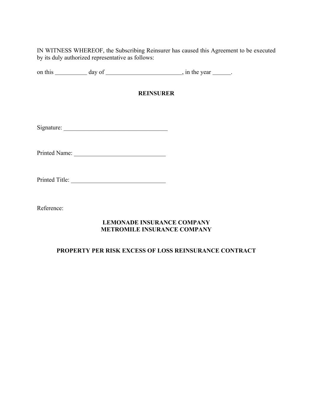 IN WITNESS WHEREOF, the Subscribing Reinsurer has caused this Agreement to be executed by its duly authorized representative as follows: on this day of , in the year . REINSURER Signature: __________________________________ Printed Name: ______________________________ Printed Title: _______________________________ Reference: LEMONADE INSURANCE COMPANY METROMILE INSURANCE COMPANY PROPERTY PER RISK EXCESS OF LOSS REINSURANCE CONTRACT